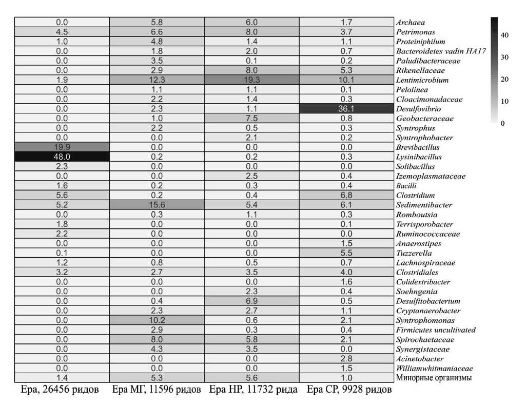 Домен Bacteria при пороге отсечения 1% представлен 20-ю таксономическими группами. Представители домена Archaea совокупно составляют 0.025%. При внесении ВПС во всех вариантах (НР, МГ, СР) повысилась степень разнообразия сообщества, при этом доля домена Archaea выросла до 1.7‒6.0%, а бактерий родов Lysinibacillus и Brevibacillus ‒ упала до 0.1‒0.3%. В сообществе в МГ, НР и СР условиях выявлено 29, 35 и 35 групп соответственно. В МГ условиях преобладающими стали Sedimentibacter (15.6%), в НР – Lentimicrobium (19.3%), в СР – новая группа Desulfovibrio (36.1%). Кроме того, зафиксировано появление новых групп: рода Syntrophomonas (10.2%) и сем. Spirochaetaceae (8.0%) в МГ условиях, рода Desulfitobacterium (6.9%), сем. Spirochaetaceae (5.8%), Geobacteraceae (7.5%) и Rikenellaceae (8.0%) в НР условиях и сем. Rikenellaceae (5.3%) в СР условиях.