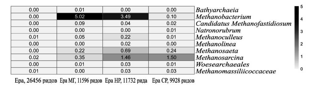 Рис. 9. Тепловая карта распределения 10 доминантных таксономических единиц архей по 4 библиотекам, представляющим архейный компонент микробных сообществ до и после контакта с ВПС. Представленность родов рассчитана как отношение количества ридов, принадлежащих представителям данного рода, к общему количеству ридов в соответствующей библиотеке.
