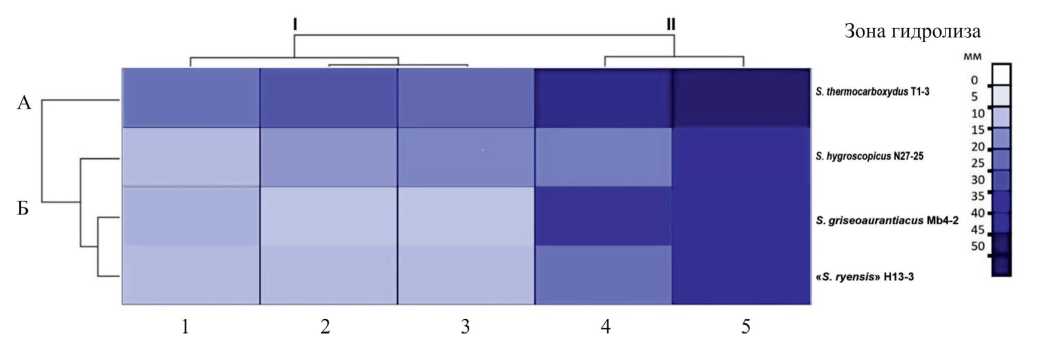 Столбцы обозначают различные источники целлюлозы, а строки – исследуемые штаммы. Наибольшей активностью деструкции модельных целлюлозных субстратов, судя по величине зон гидролиза, характеризовался S. thermocarboxydus T1-3. Так, обесцвеченные зоны гидролиза МКЦ и КМЦ составили у этого штамма 51 ± 3 и 48 ± 2 мм соответственно, т.е. существенно превысили зоны гидролиза КМЦ, образуемые лучшими целлюлолитическими изолятами стрептомицетов из почв Египта – 25 мм (Waheeb et al., 2021) и соляных лагун Мексики – от 30 мм (Escudero-Agudelo et al., 2023). Кластеризация полученных данных автоматизированным алгоритмом выделила штамм S. thermocarboxydus T1-3 в отдельный кластер А, объединив в кластер Б три другие культуры S. griseoaurantiacus Мb4-2, S. hygroscopicus N27-25 и “S. ryensis” Н13-3, менее эффективно разлагающие как кристаллические формы целлюлозы, так и природные целлюлозосодержащие субстраты. Между собой штаммы кластера Б различались, в основном, по способности к деструкции дубового опила и КМЦ.
