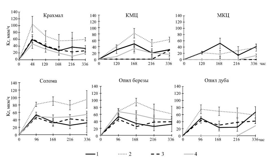 Наиболее быстрым ростом в течение всего времени экспозиции (Кr = 87 ± 3 мкм/ч) штамм характеризовался на среде с соломой. На всех средах, содержащих природные растительные материалы, до 168 ч экспозиции Кr была примерно одинакова, затем на средах с древесным опилом, как и на среде с КМЦ, постепенно снижалась (рис. 2).
