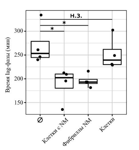 Рисунок. Бактериальные клетки с фибриллами Sup35NM ускоряют агрегацию белка Sup35NM in vitro. ∅ ‒ спонтанная агрегация Sup35NM. “Н.з.” ‒ отсутствие значимых отличий; * ‒ p-value < 0.05 (критерий Вилкоксона).