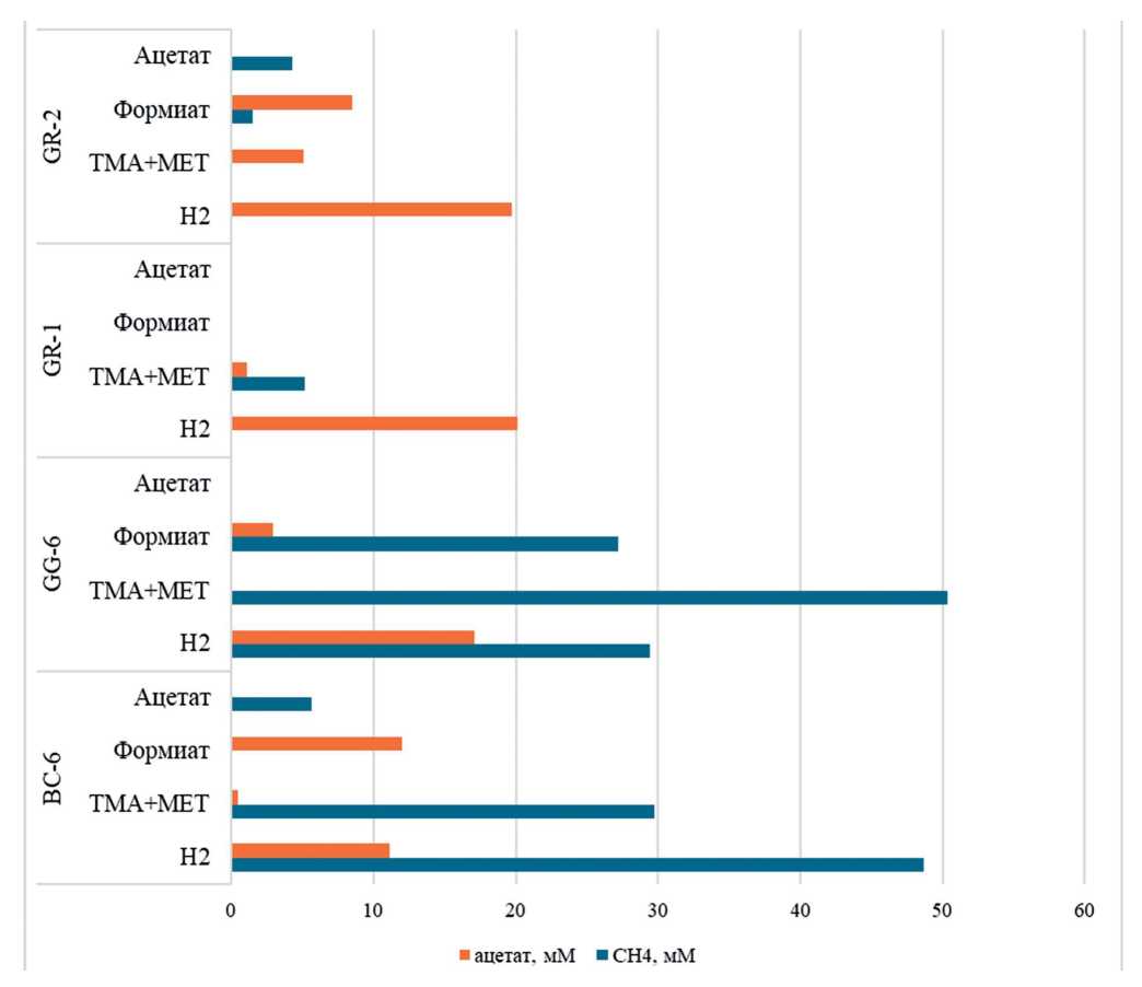 Накопительные культуры. При посеве проб на среды с вышеперечисленными субстратами метаногенеза и инкубации при температуре 6 или 18°С рост был детектирован только при 18°С. В накопительных культурах были выявлены метилотрофные и гидрогенотрофные метаногены и ацетогены. При 6°С после инкубации в течение года роста микроорганизмов и метаногенеза не было выявлено. В пробах над газогидратами (GR-1, GR-2) водород использовался исключительно на ацетогенез. На метилированных соединениях рост был незначительным, и небольшое количество ацетата образовалось в обеих пробах, наряду с метаном в пробе GR-1. Ацетат и формиат либо не использовались (проба Gr-1), либо использовались крайне слабо (проба Gr-2), что не дало возможности получить устойчивые накопительные культуры метаногенов на этих субстратах. В пробах зоны нефтепроявления (BС-6, GG-6) метилированные соединения использовались исключительно метаногенами, но и на водороде шло их развитие, наряду с ацетогенами. Небольшое образование метана из ацетата было детектировано только в пробе ВС-6. В пробе GG-6 формиат преимущественно использовался на метаногенез, а в пробе ВС-6 на ацетогенез (рис. 1).