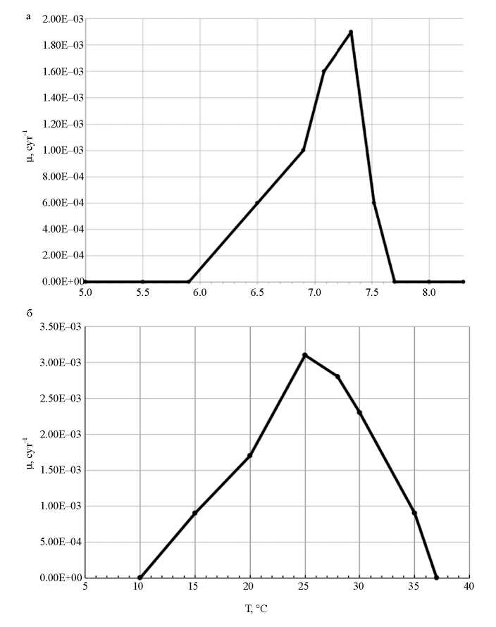 Физиологические характеристики. Зависимости скорости метаногенеза от pH и температуры определяли на среде с метанолом как субстратом в пробирках Хангейта в двух повторностях. Зависимость роста микроорганизма от рН определяли при 25°С. Значения рН устанавливали добавлением растворов 6 н HCl или 6 н NaOH. Температурную зависимость роста штамма определяли в области от 5 до 40°С с шагом в 5°С.