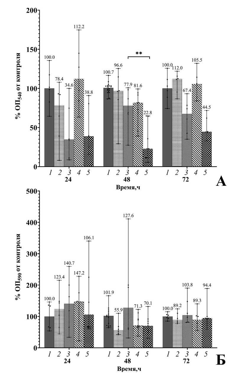 Рис. 1. Влияние комбинации азитромицина и норадреналина на рост планктонных культур (а) и биопленок (б) K. Schroeteri : 1 – контроль; 2 – азитромицин 0.001 мкг/мл; 3 – азитромицин 4 мкг/мл; 4 – сочетание норадреналина 3.55 мкМ и азитромицина 0.001 мкг/мл; 5 – сочетание норадреналина 3.55 мкМ и азитромицина 4 мкг/мл. ** – различие достоверно при р < 0.01.
