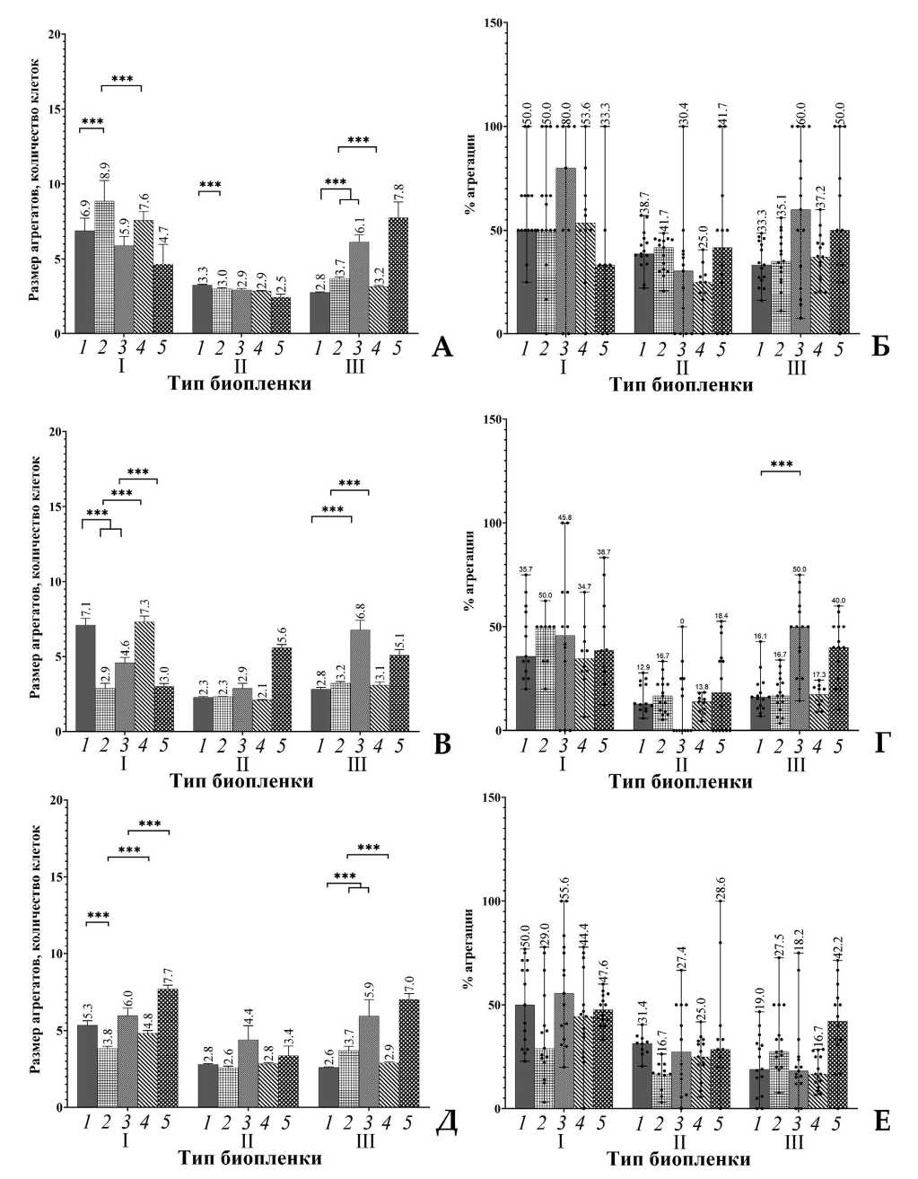 Следует отметить, что степень агрегации в моновидовых биопленках K. schroeteri была выше, чем в других исследованных биопленках. Максимальное количество агрегатов обнаружено через 24 ч инкубации и составляло 71% от совокупного количества агрегатов и одиночных клеток, наблюдавшихся в поле зрения (рис. S3Б), тогда как через 72 ч инкубации число агрегатов снижалось до 63% (рис. S3Е). В моновидовых биопленках S. aureus относительное количество агрегатов было максимальным через 48 ч и составляло 56% (рис. S3Г).