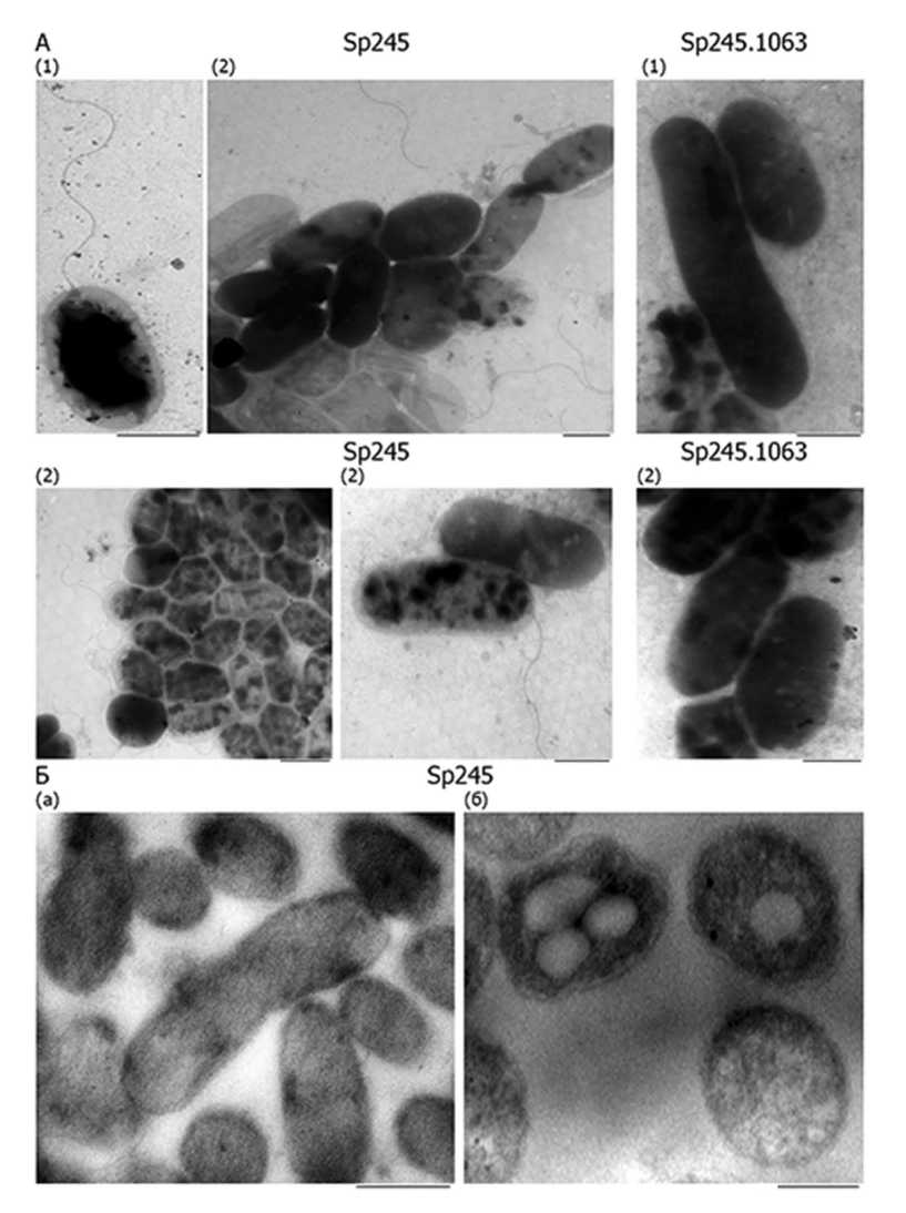 Рис. 1. А ‒ Просвечивающая электронная микроскопия клеток A. baldaniorum Sp245 и Sp245.1063 из 20 ч жидких культур (1) или биопленок (2), сформированных на стекле под жидкой средой за 6 сут культивирования. Б ‒ Просвечивающая электронная микроскопия ультратонких срезов клеток A. baldaniorum Sp245 из фрагментов биопленок, сформированных под жидкой средой на поверхности стекла за 6 сут культивирования. На панели (а) представлены “вегетативные” и “длинные” клетки, на панели (б) показаны “цистоподобные формы”. Масштабная линейка ‒ 1 мкм.
