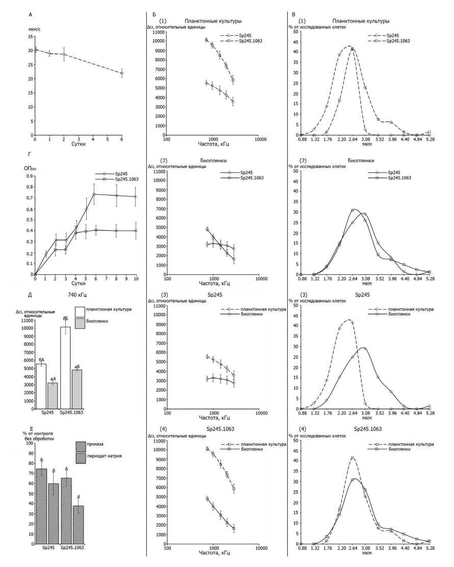 Рис. 2. А ‒ Влияние состава среды на скорость движения планктонных клеток A. baldaniorum Sp245 в жидкой среде. Б ‒ Электрофизические профили бактерий из планктонных 20-ч жидких культур и 6-сут биопленок. В ‒ Распределение клеток по длине. Средняя длина клеток A. baldaniorum Sp245 и Sp245.1063 соответственно штамму в 20 ч планктонных жидких культурах составляла (2.6 ± 0.3) и (2.1 ± 0.2) мкм, (2.8 ± 0.3) и (2.8 ± 0.2) мкм в случае 6-сут биопленок. Г ‒ Динамика накопления биомассы в биопленках, сформированных A. baldaniorum Sp245 и Sp245.1063 на стекле под жидкой LB. ОП590 – оптическая плотность кристаллического фиолетового, десорбированного после окрашивания биопленок. Д ‒ Результаты изменения величины электрооптического сигнала клеток на частоте 740 кГц. Е ‒ Влияние проназы и периодата натрия на биомассу 6-сут биопленок, сформированных на стекле под жидкой средой LB. % – процентное отношение оптической плотности красителя, десорбированного с окрашенных пленок после их инкубации в растворе проназы или периодата натрия к аналогичному показателю без обработки. Однофакторный дисперсионный анализ (ANOVA) данных на панелях (Д) и (Е) проводили, сравнивая показатели каждого штамма (строчные буквы) или сопоставляя показатели Sp245 и Sp245.1063 (заглавные буквы); разными буквами обозначены статистически значимые различия; а, а, А и А – средние значения с наименьшей величиной.