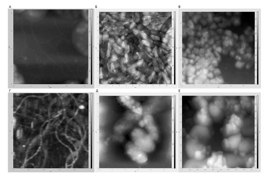 Рис. 3. Результаты атомно-силовой микроскопии. АСМ-изображения 6-сут биопленок штамма A. baldaniorum Sp245, сформированных на разделе жидкая LB/стекло (А, Б, Г, Д), жидкая LB/воздух (В, Е).