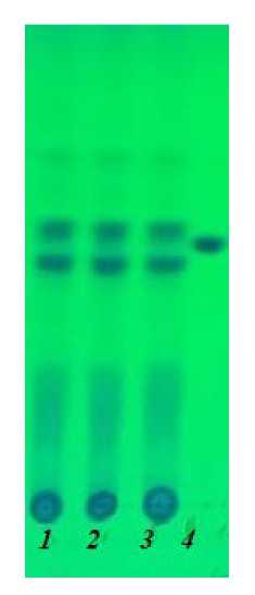 Рис. 4. Хроматограмма экстрактов под УФ-светом (λ = 254 нм) из биомассы штаммов C. militaris : 1 ‒ 11-3; 2 ‒ 11-4; 3 ‒ 11-5; 4 ‒ стандарт кордицепина.