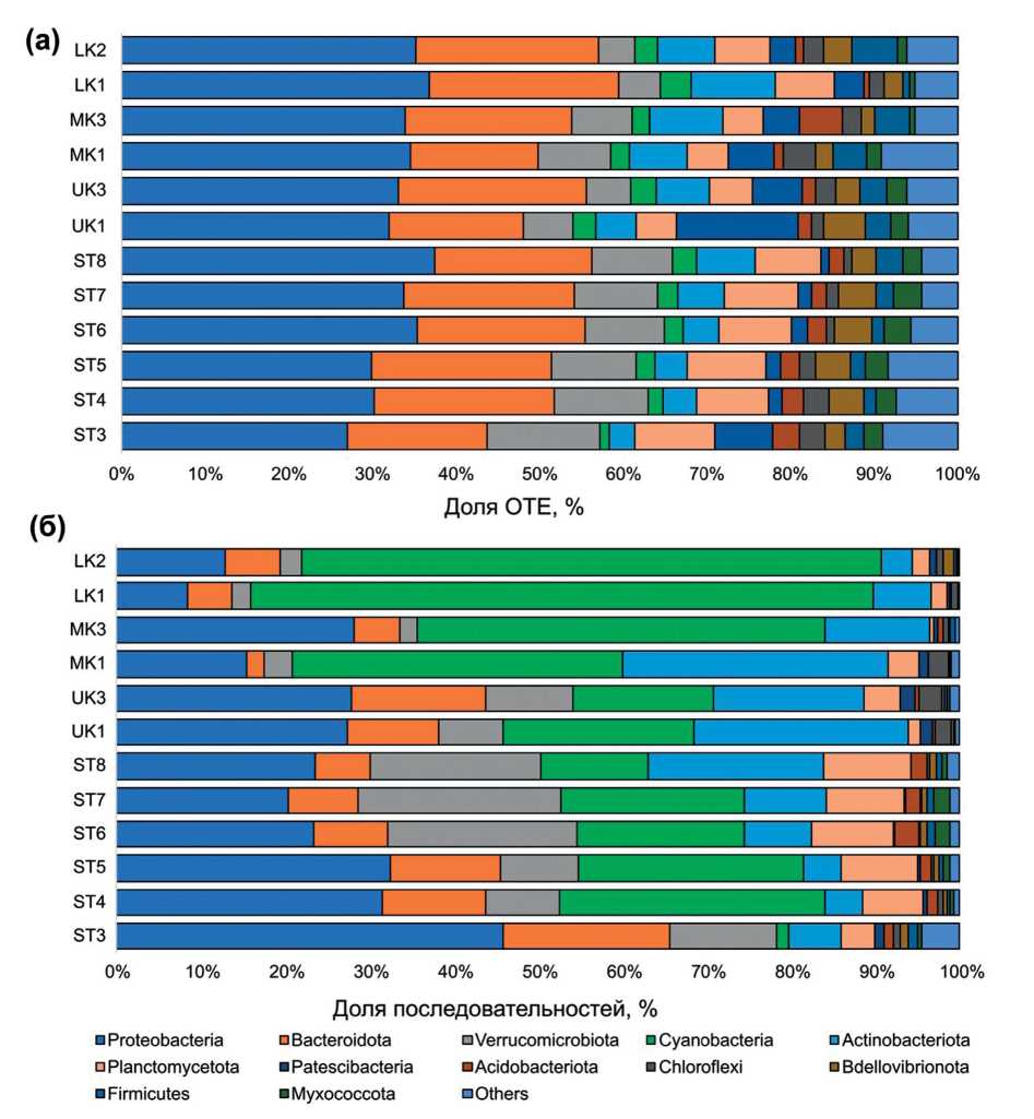 В то же время доля последовательностей, принадлежащих к тем или иным филумам (рис. 1б), существенно различалась от пробы к пробе. Доля шести филумов превышала 10% хотя бы в одной пробе: Cyanobacteriota и Proteobacteria – в 11 из 12 проб каждый, Actinomycetota, Verrucomicrobiota и Bacteroidota – в пяти пробах, и Planctomycetota – в единственной пробе, ST8.