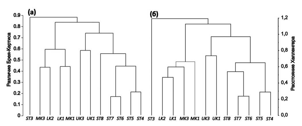 Кластерный анализ сообществ разных проб, проведенный с использованием количественной меры различия Брея‒Куртиса и расстояния Хеллингера, позволил выделить четыре кластера: 1 ‒ речной (проба ST3), 2 ‒ зону залива и водохранилище (пробы ST4‒ST8) (с заметным отличием ST8 от остальных), 3 ‒ оз. С. и Н. Кабан (пробы MK1, MK3, LK1 и LK2) и 4 – оз. В. Кабан (пробы UK1 и UK3), хотя порядок объединения этих кластеров зависел от использованной меры различия и метода кластеризации (рис. 2).