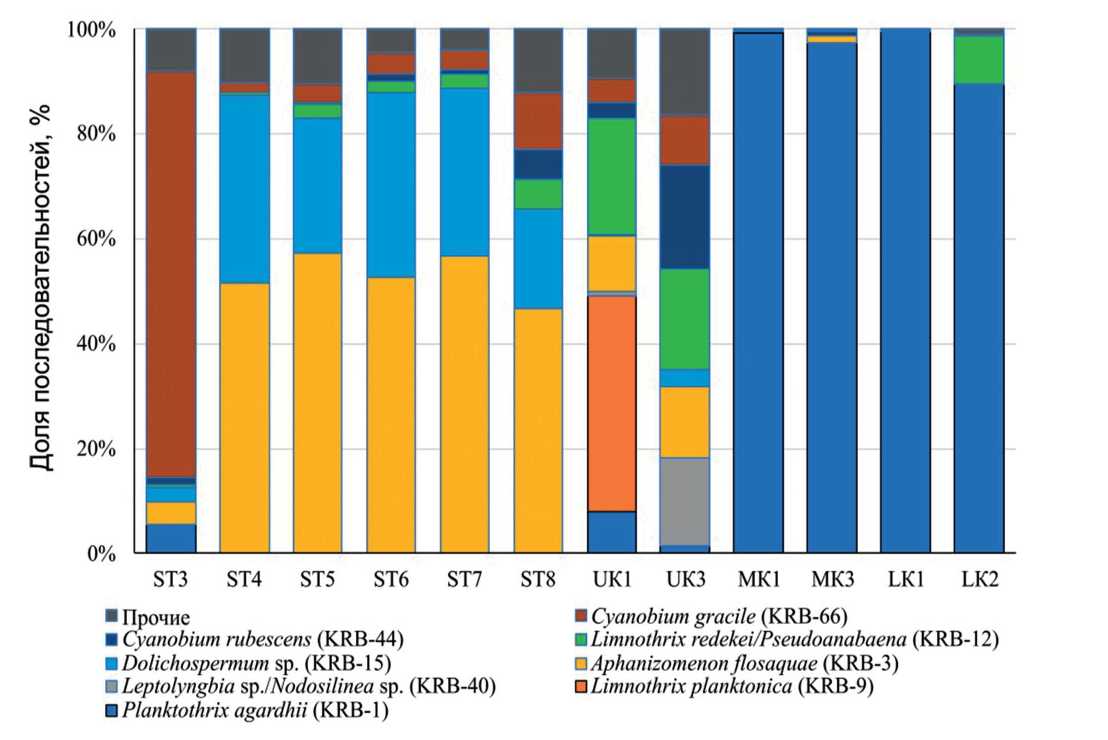 Развитие цианобактерий в исследованных пробах было очень контрастным. В озерах С. и Н. Кабан доля цианобактерий составляла более 39% всех бактериальных последовательностей; в оз. В. Кабан, Куйбышевском водохранилище и Усинском заливе она составляла от 12 до 30%, а в реке Уса ‒ менее 1.4% (табл. 2). При наибольшем количестве цианобактерий, озера С. и Н. Кабан отличались их наименьшим разнообразием и наибольшим доминированием (табл. 2). В них присутствовали 11‒13 ОТЕ, причем очень сильно (от 87.5 до >99.5% всех цианобактерий) доминировала единственная ОТЕ, KRB-1, с последовательностью, идентичной Planktothrix agardhii (Phormidiaceae: Oscillatoriales) (рис. 3).
