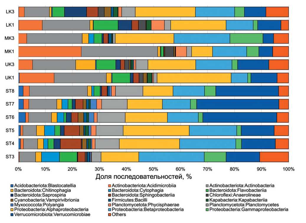 Намного более существенный вклад вносят актинобактерии, в основном класс Actinobacteriia, однако на станциях озер системы Кабан, особенно летом 2016 г., заметную часть составляют и Acidimicrobiia. Велик также вклад V errucomicrobiota, особенно на ST6‒ST8 акватории Куйбышевского водохранилища. Среди других филумов можно отметить также Planctomycetota, особенно класс Planctomycetia, доля которых на станциях Усинского залива и Куйбышевского водохранилища приближается к 10%. Значительно и суммарное обилие Bacteroidetes s.str., но оно в большей или меньшей степени распределено по пяти классам этого филума, каждый из которых достигает заметных количеств, >5%, только в одной‒двух пробах, и только Flavobacteriia – в четырех (рис. 4). Остальные классы имеют еще меньшее значение: так, доля Blastocatellula (Acidobacteriota) и Poliangia (Mixococcota) превышает 1% на станциях водохранилища и залива, но они почти отсутствуют в р. Уса и озерах системы Кабан; распределение Anaerolineae (Chloroflexota) почти противоположно. Oligoflexia (Bdellovibrionota), составляющие около 3% последовательностей в пробе LK3, минорны во всех остальных пробах. В вариации долей Phici sphaerae (Planctomycetota) и Vampirovibrionota (= Melainabacteriia, Cyanobacteria) не наблюдается очевидной закономерности (рис. 4).