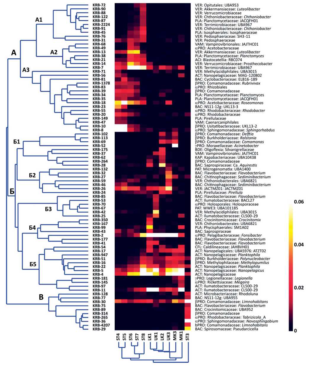 Рис. 5. Результаты двустороннего (two-way) кластерного анализа доминирующих ОТЕ гетеротрофных бактерий по доле численности с использованием хордового расстояния в качестве меры сходства. Справа – консенсусная таксономическая принадлежность ОТЕ по базам данных ARB-Silva и GTDB. Трехбуквенные обозначения филумов/классов: ACI – ацидобактерии; ACT – актинобактерии; BAC – Bacteroidota;BDE – Bdellovibrionota = Oligoflexota;CFL – Chloroflexota;KAP – Kapabacterota;PAT – Patescibacteria;PLA – Planctomycetota;a-, b-, и g-PRO – протеобактерии; VAM – Vampirovibryonota;VER – Verrucomicrobiota.