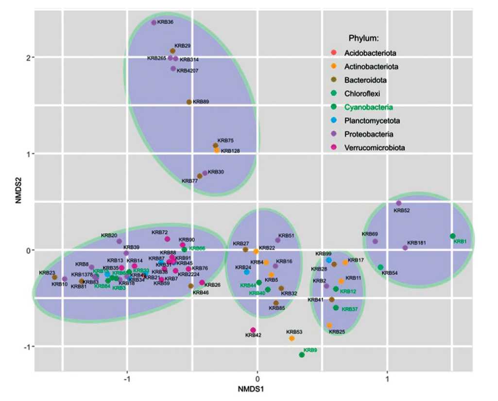 Рис. 6. Неметрическое шкалирование доминирующих ОТЕ по величинам несходства Брея‒Кертиса. Темно-серыми овалами показаны визуально выделяемые группировки ОТЕ.