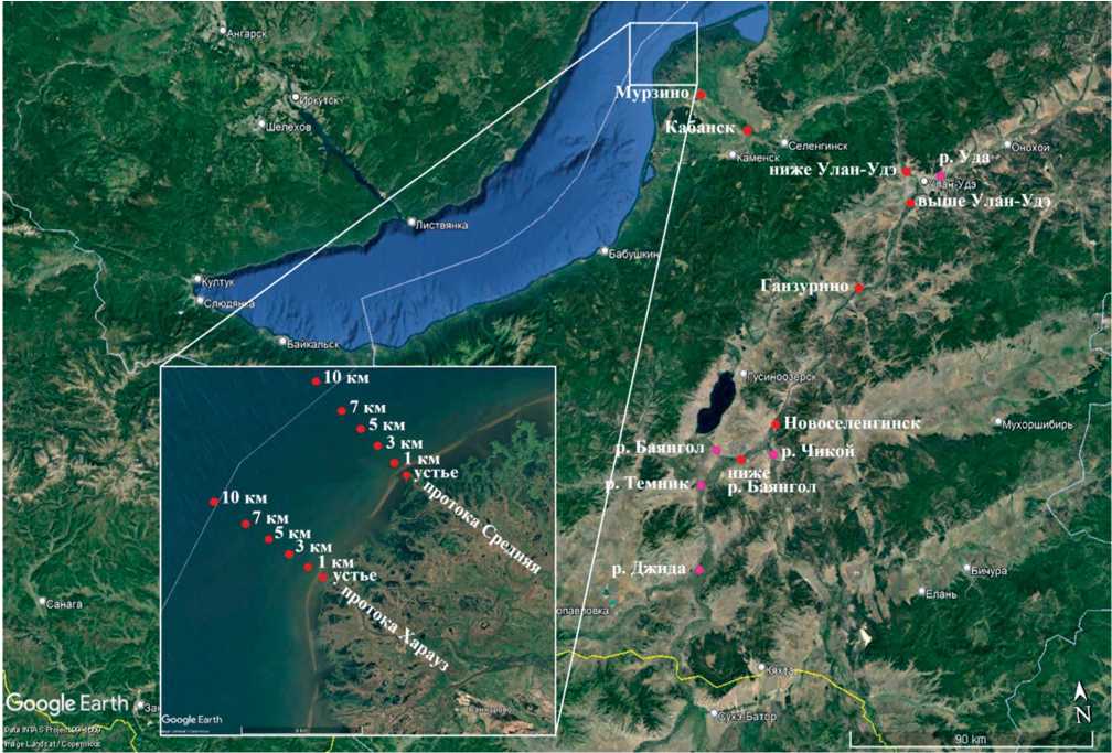 Рис. 1. Карта-схема района исследований и мест отбора проб, построенная с использованием карт Google Earth Pro https://www.google.com/intl/ru/earth/ver-100sions/#earth-pro). 🔴 – приток.