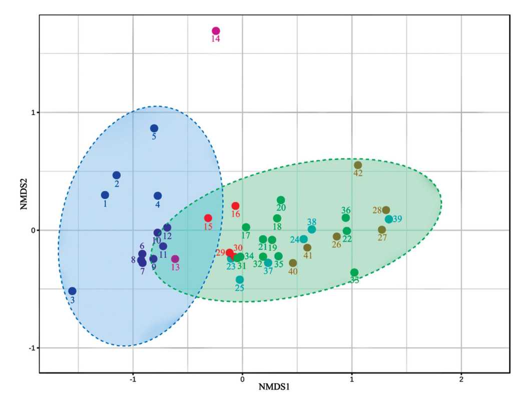Рис. 3. График неметрического многомерного шкалирования (NMDS) несхожести бактериальных сообществ (бета-разнообразие для кластерного расстояния 0.03). Нумерация образцов приведена в таблице и в подписи к рис. 2.