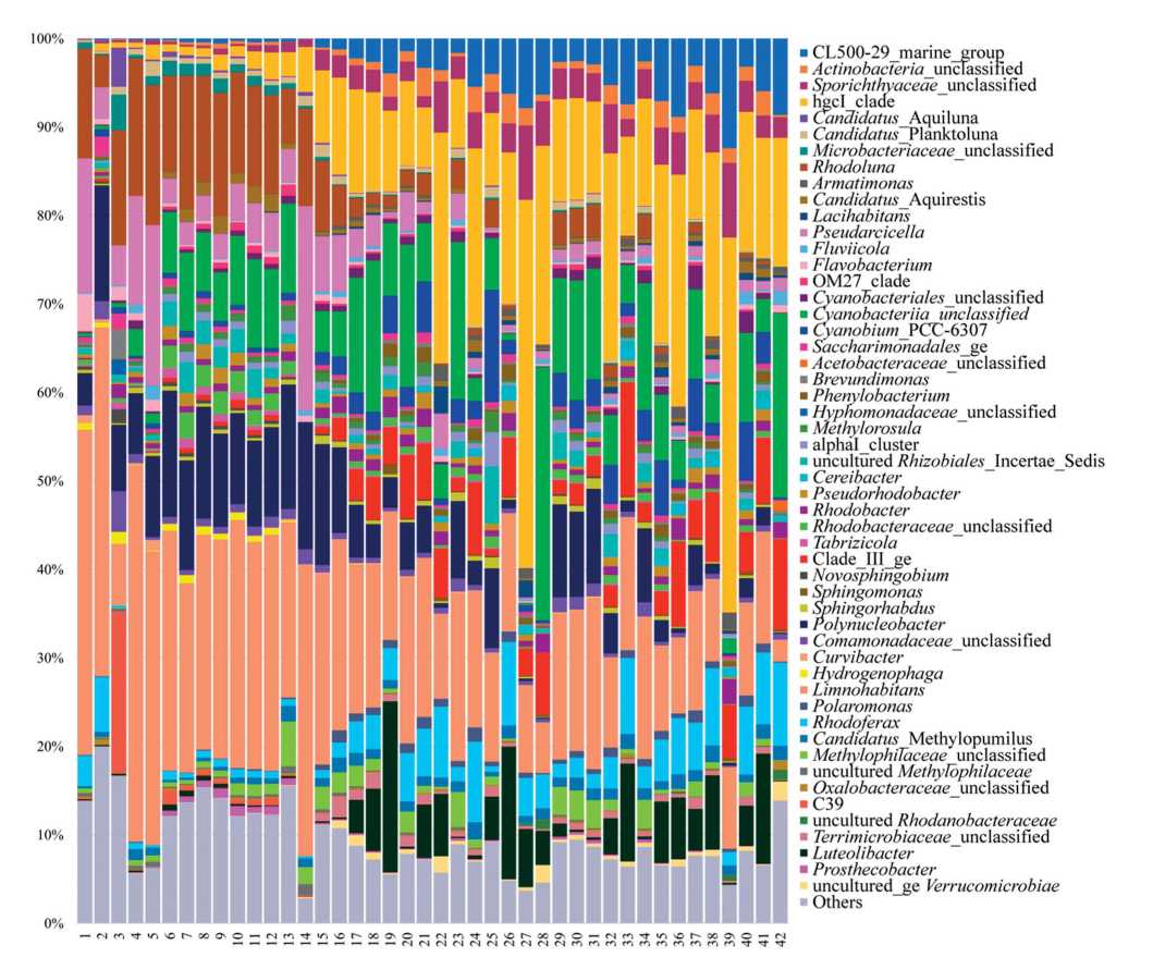 Следует отметить, что только 17 ОТЕ являлись общими для всех 42 образцов, которые составляли 0.43% от всего количества ОТЕ и 33.18% от общего количества чтений. Они относились к таким родам как L imnohabitans, Polynucleobacter, hgcI_clade, Sporichthyaceae _unclassified, Luteolibacter, Rhodoluna, Rhodoferax, MWH-Ta3 (Microbacteriaceae), Pseudarcicella, Candidatus _Planktoluna, Methylotenera, uncultured Oxalobacteraceae.