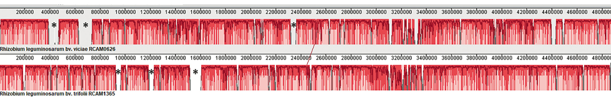 Рис. 1. Выравнивание хромосом геномов штаммов RCAM1365 и RCAM0626. Звездочкой отмечены три самых крупных уникальных фрагмента для каждой из хромосом.