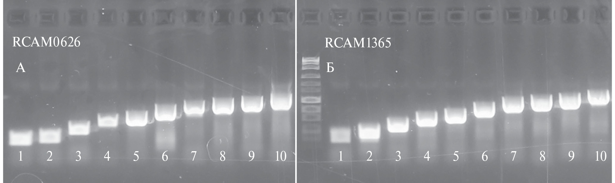 Рис. 2. Амплификация маркерных фрагментов для штамма RCAM0626 (а) и RCAM1365 (б). Номера соответствуют праймерам в табл. 2 и 3.