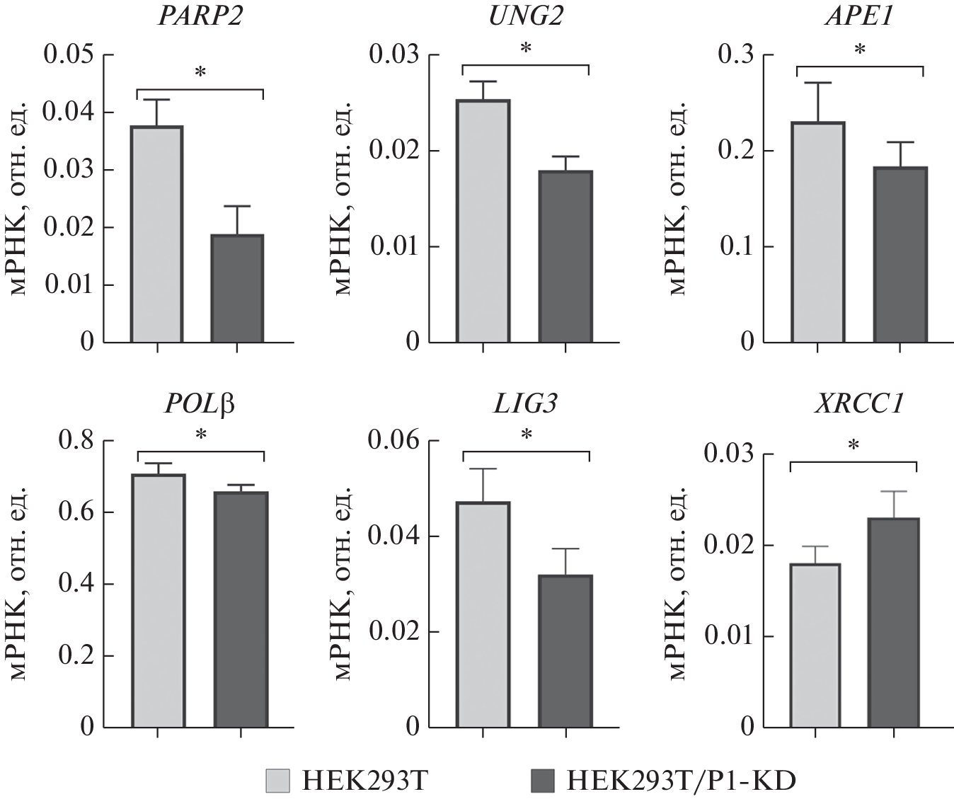 The base excision repair (BER) system is aimed at repair of the largest group of DNA lesions, namely of damaged bases. The main steps in BER are: recognition and removal of the aberrant base, cutting the DNA sugar-phosphate backbone, gap processing (including dNMP insertion), and DNA ligation. The precise functioning of BER depends on the regulation of each step of the process by regulatory/accessory proteins, the most important of which is poly(ADP-ribose)polymerase 1 (PARP1). PARP1 plays an important role in various processes of DNA repair, maintenance of genome integrity, and regulation of mRNA stability and decay. In this regard, PARP1 can affect BER both at the level of proteins involved in the process and at the level of expression of the mRNAs encoding them. There are no systematic data on the effect of various amounts of PARP1 on the activity of key BER proteins and the levels of mRNAs encoding them in human cells. In our work, using whole-cell extracts and RNA preparations obtained from the parental HEK293T cell line and its derivative HEK293T/P1-KD cell line with reduced PARP1 expression (shPARP1-expressing cells, PARP1 knockdown), we assessed the levels of mRNA encoding BER proteins: PARP1, PARP2, uracil DNA glycosylase (UNG2), AP endonuclease 1 (APE1), DNA polymerase β (POLβ), DNA ligase III (LIG3), and XRCC1. In parallel, the catalytic activity of these enzymes was evaluated. No significant effect of the PARP1 amount of on the mRNA levels of UNG2, APE1, POLβ, LIG3, and XRCC1 was found. At the same time, in HEK293T/P1-KD cells, the amount of PARP2 mRNA was reduced by 2 times. The activities of these enzymes in whole-cell extracts of HEK293T and HEK293T/P1-KD cells also did not differ significantly. Under the conditions of poly(ADP-ribose) synthesis, the efficiency of the reactions catalyzed by UNG2, APE1, POLβ, and LIG3 also did not change significantly. In addition, it was shown that a reduced amount of PARP1 in the extract of HEK293T/P1-KD cells does not cause fundamental changes in the nature of DNA PARylation compared to the extract of the parental HEK293T cell line.