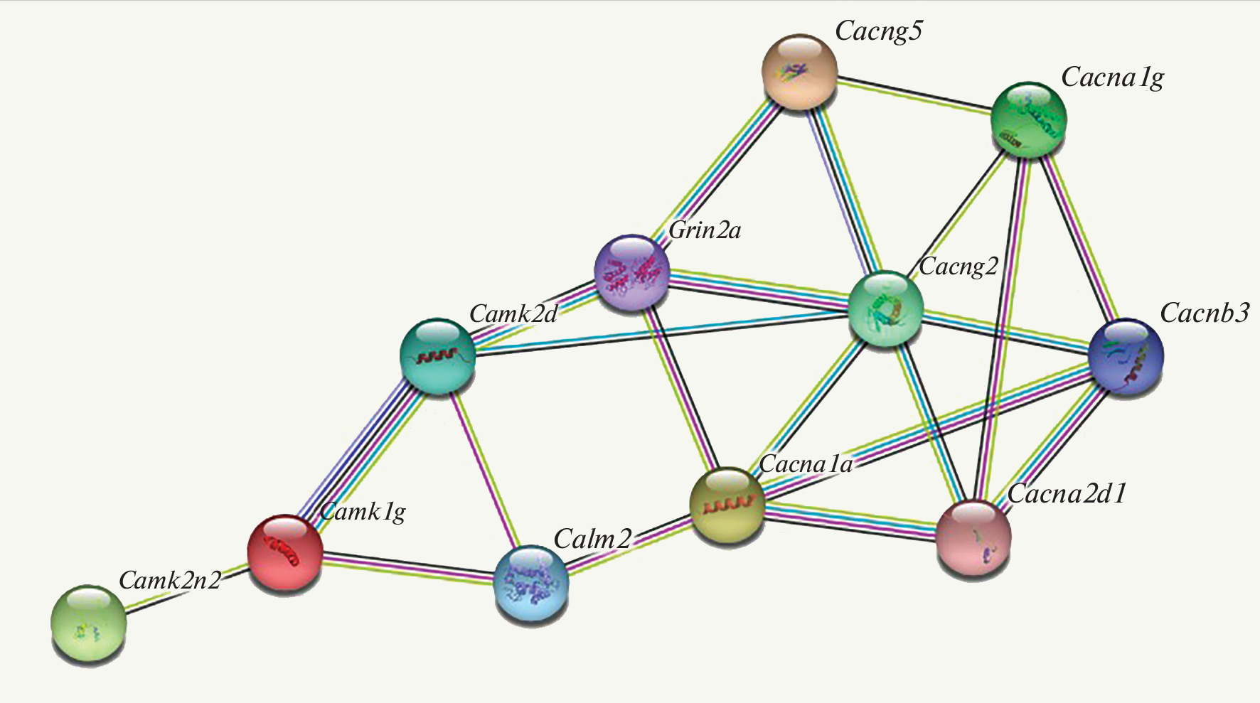 Используя данные полного транскриптомного анализа, исследовали изменение экспрессии генов, кодирующих белки, вовлеченные в процессы кальциевой регуляции, в гиппокампе самцов мышей с симптомами депрессии, вызванными хроническим социальным стрессом. Экспрессия генов Cacna1g, Cacnb3, Camk1g, Camk2d, Camk2n2, Caly, Caln1, S100a16, Slc24a4 в гиппокампе депрессивных животных была выше, а экспрессия генов Cacna2d1, Cacng5, Grin2a, Calm2 – ниже, чем в контроле. Наибольшее число значимых корреляционных взаимосвязей выявлено между экспрессией гена Сalm2, имеющего наибольшую транскрипционную активность, и других дифференциально экспрессируемых генов. Предполагается, что под влиянием хронического социального стресса происходит нарушение кальциевой сигнализации в гиппокампе мышей. Обсуждается участие в этом процессе гена Calm2 и генов Сamk1g, Camk2d и Сamk2n2.