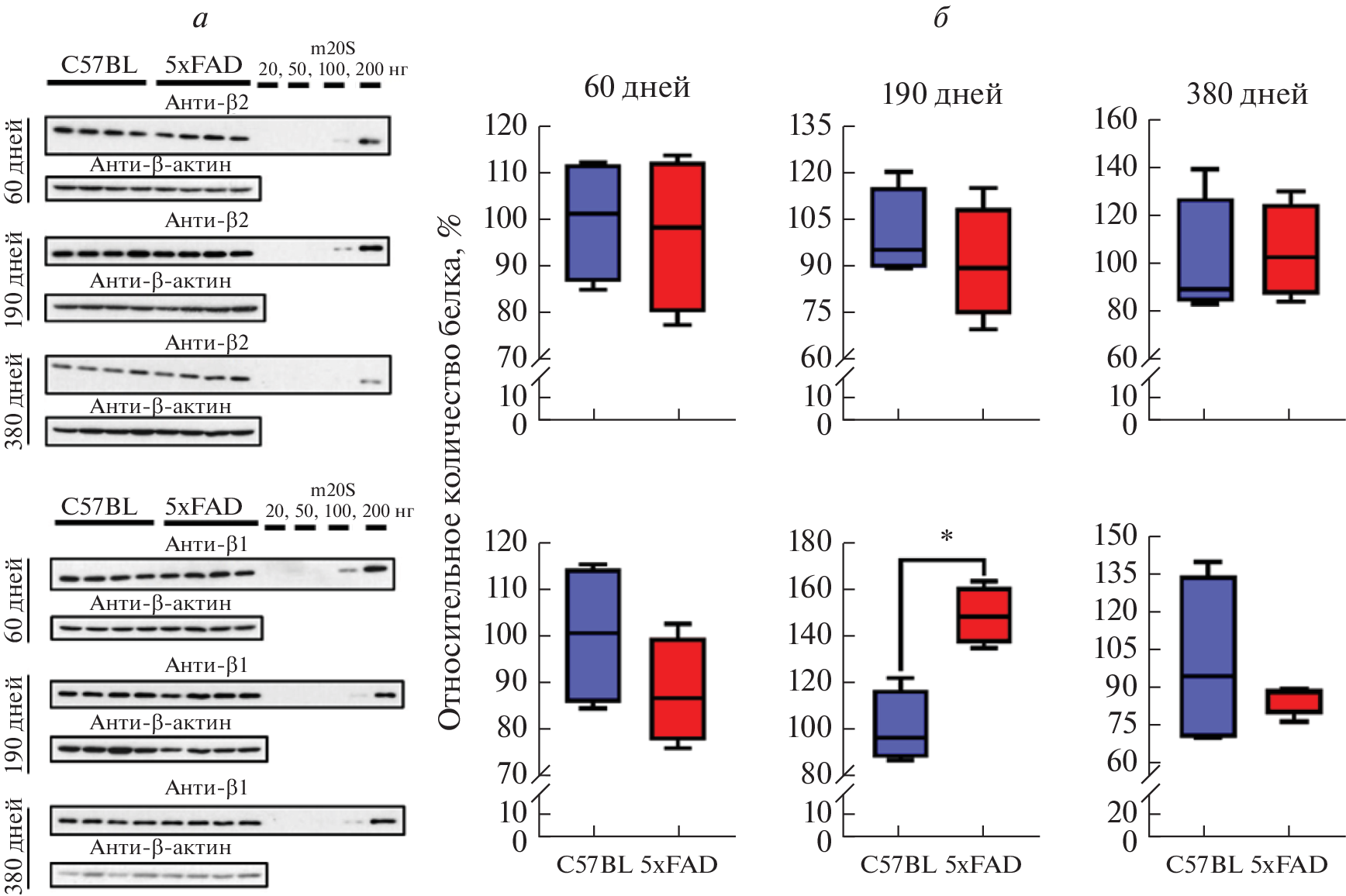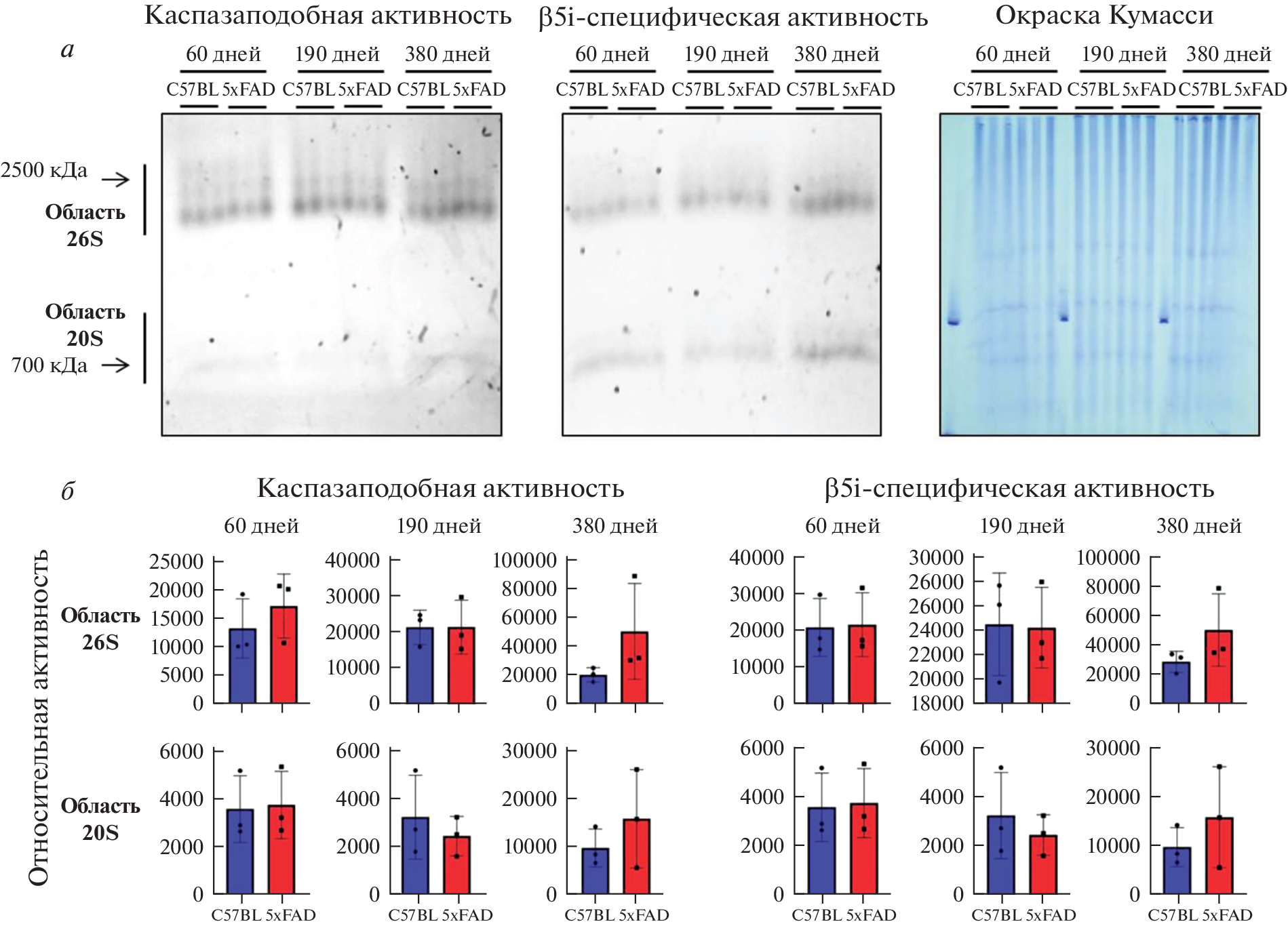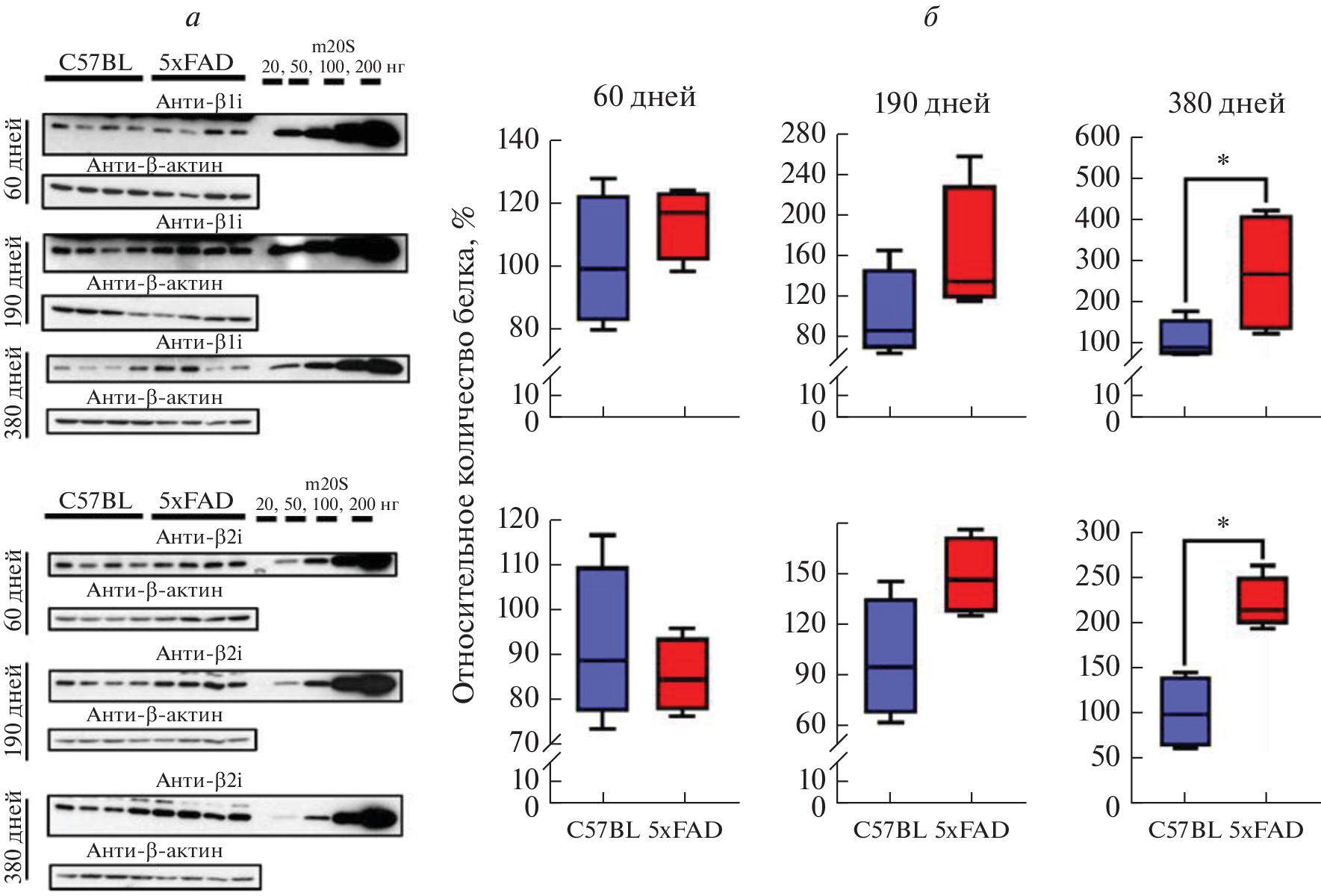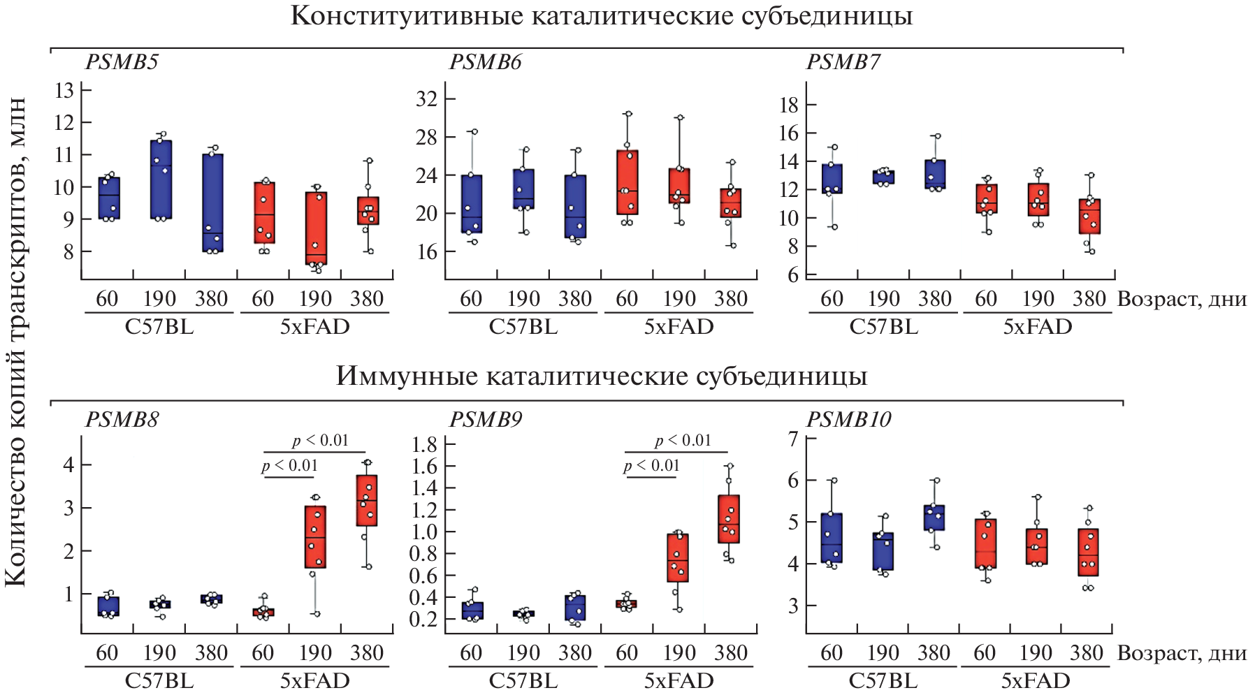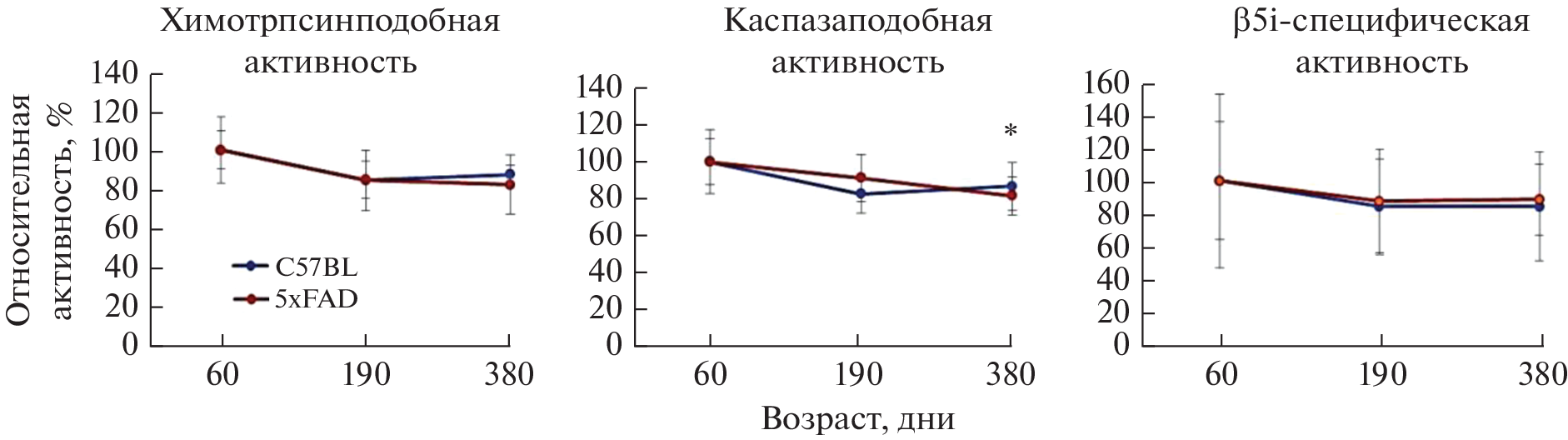 The ubiquitin-proteasome system (UPS) provides hydrolysis of most intracellular proteins in proteasomes. There are various forms of proteasomes differing, among other things, in the set of proteolytic subunits and the presence of activators. Alzheimer’s disease (AD) is characterized by disturbances in the functional state of the UPS. At the same time, an increase in the expression of certain forms of proteasomes, in particular, proteasomes containing immune subunits (non-constitutive proteasomes), was shown. Here, we studied dynamic changes in the expression of catalytic proteasome subunit genes and protein content in the cerebral cortex of animals using a mouse model of AD (5xFAD transgenic mice). In samples from 5xFAD mice, at the age of 380 days, compared with samples from mice of 60 days of age, 4 and 6 times more gene transcripts of the immune subunits PSMB9 and PSMB8 were detected, as well as a significant increase in the number of immune β-subunits (2.8 times – β1i, 2.2 times – β2i) was observed. The results obtained indicate activation of the synthesis of immune subunits and assembly of non-constitutive proteasomes at the terminal stage of pathology development. At the same time, the results of electrophoresis in native conditions indicate the activation of both 20S and 26S proteasomes containing immune subunits in samples from 5xFAD mice, 380 days of age. The obtained data, in combination with available literature, indicate that the activation of non-constitutive proteasomes is a universal phenomenon characteristic of various animal models of AD, that may reflect both the development of neuroinflammation and adaptive processes in tissues.