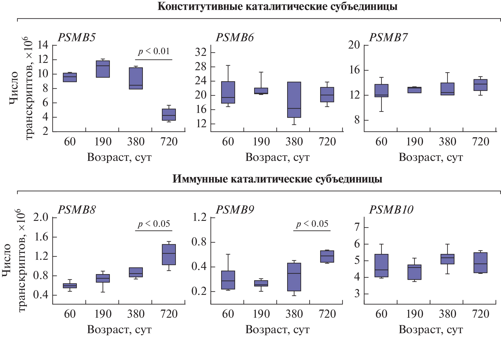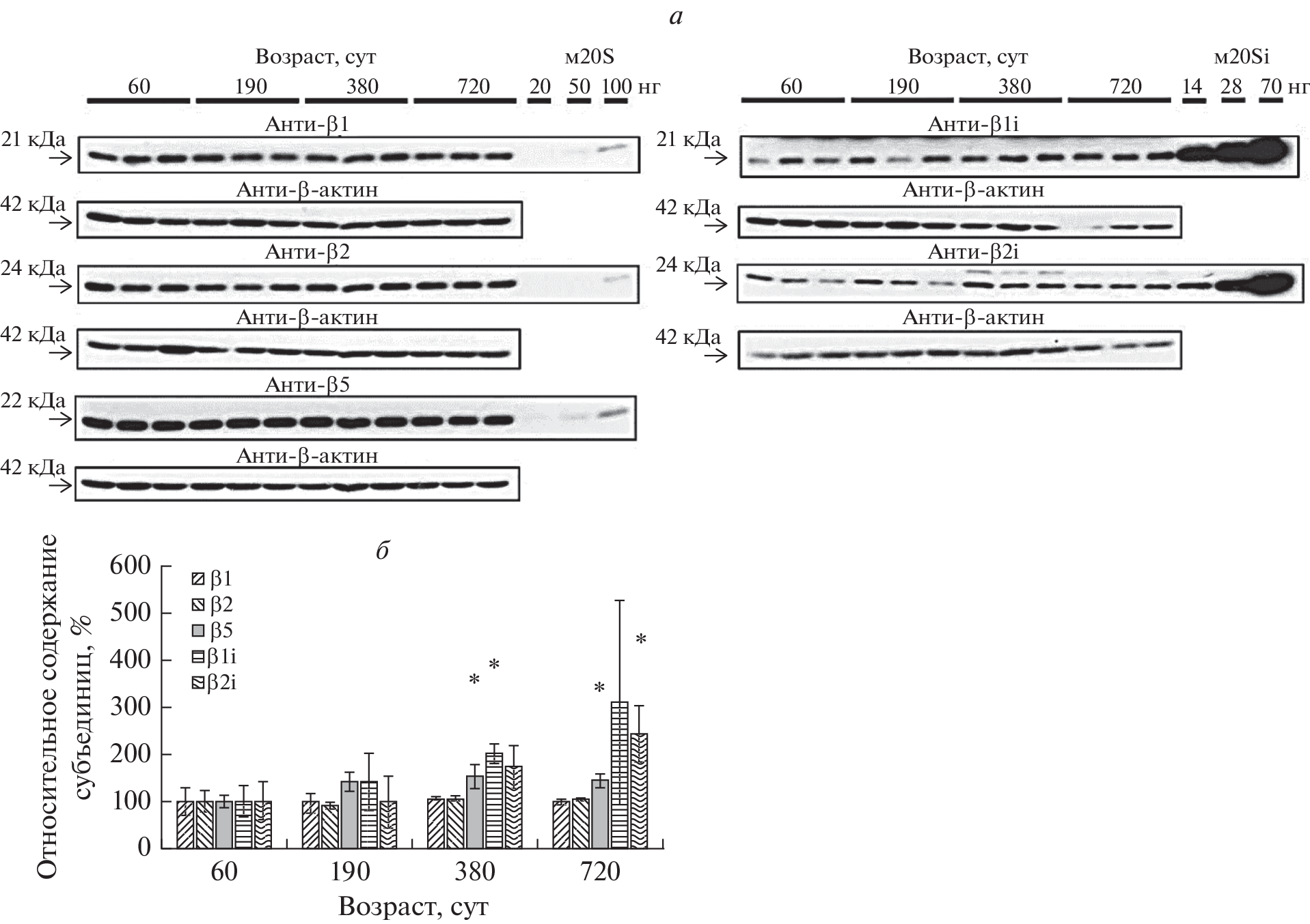 Proteasomes are key components of the ubiquitin-proteasome system. Various forms of proteasomes are known. During aging, disturbances in the functioning of proteasomes were revealed, as well as an increased expression of their individual forms. Considering these data, we studied the expression of genes encoding the constitutive and immune subunits of proteasomes in the cerebral cortex samples from C57BL/6 mice at the age of 60, 190, 380, and 720 days. In addition, the content of constitutive and immune proteasome subunits, chymotrypsin-like and caspase-like activities of proteasome pools, as well as the activity of the β5i immune subunit were studied in tissue homogenates. The chymotrypsin-like activity and the activity of the β5i subunit of different forms of proteasomes separated by electrophoresis under native conditions were characterized. Compared with samples from young animals, in the cerebral cortex of animals aged 720 days the following changes in the expression patterns of proteasome genes were revealed: a decrease in the expression of PSMB5 gene encoding the constitutive proteasome subunit β5; activation of genes encoding immune subunits β5i and β1i. In clarified tissue homogenates of aged mice, an increase in the content of immune subunits β1i and β2i was shown. In samples from old animals, decreased chymotrypsin-like activity and a tendency to a decrease in caspase-like activity of proteasomes as well as the β5i subunit activity were also revealed. Analysis of the activity of native complexes in the tissues of old animals revealed decreased chymotrypsin-like activity of both 26S and 20S proteasomes containing the β5i subunit. Based on the data obtained, it can be assumed that changes in the pool of non-constitutive proteasomes reflect aging-associated adaptive processes in mouse brain.