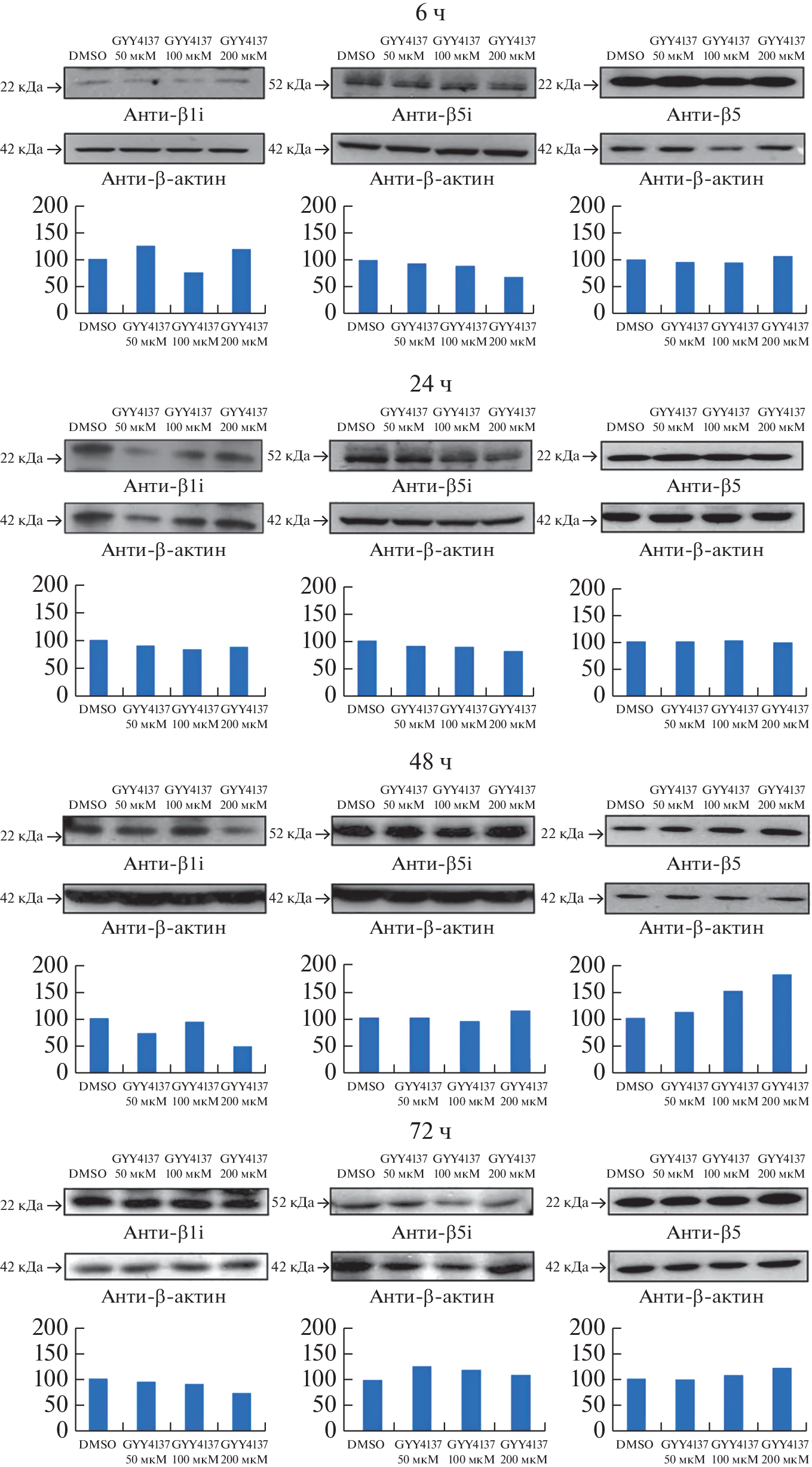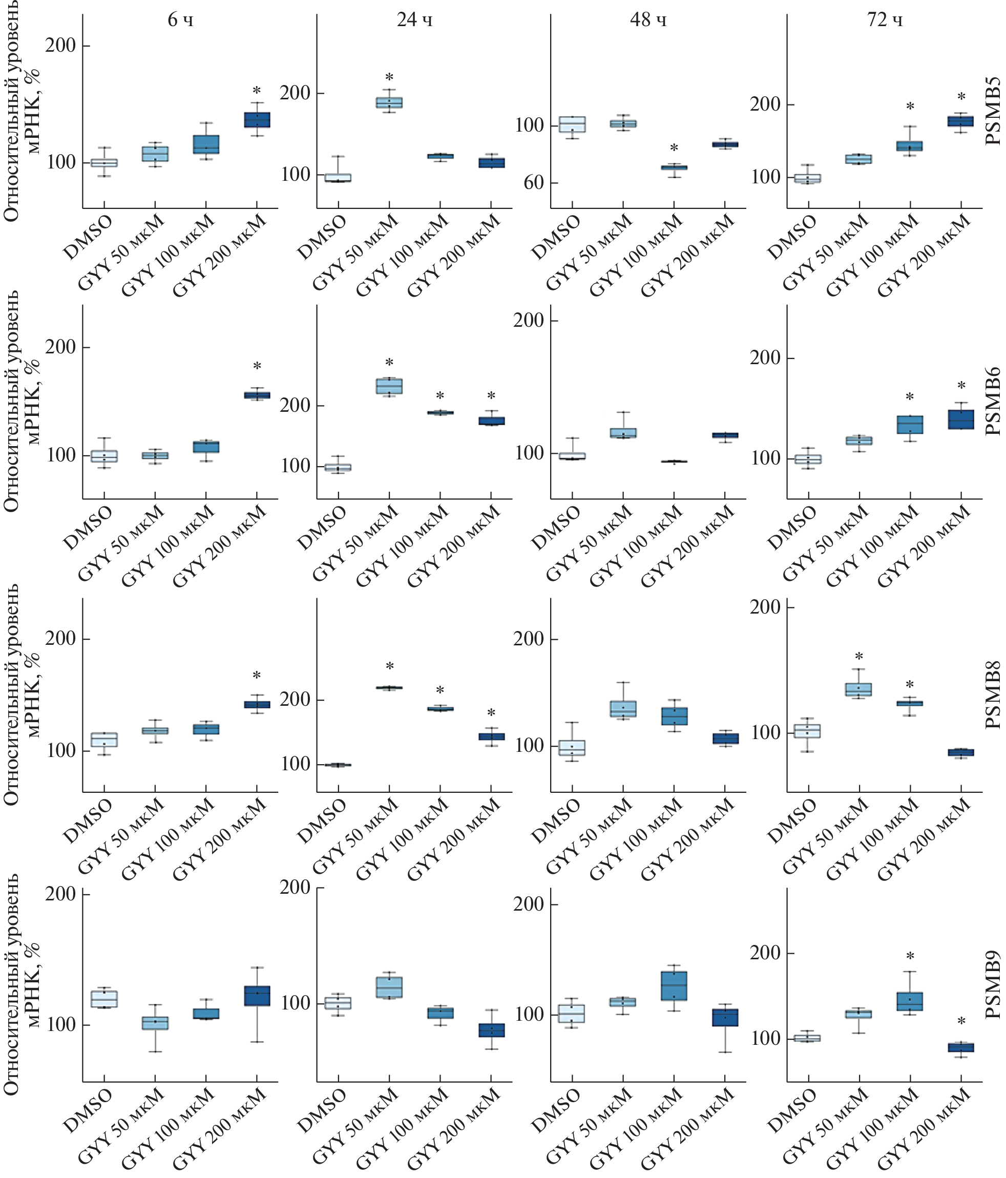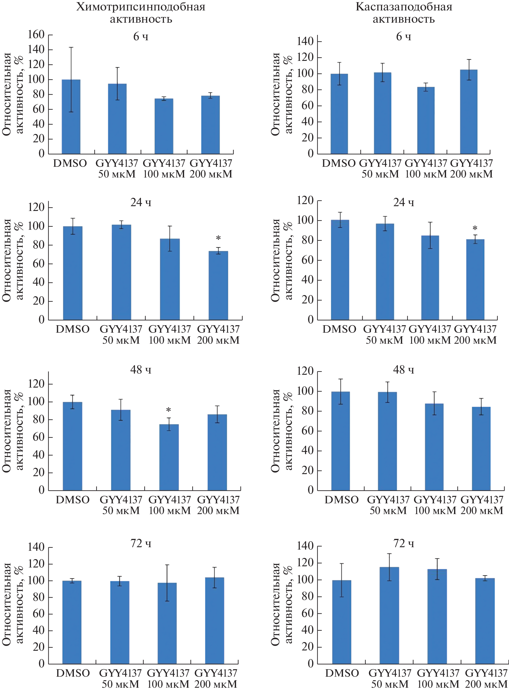 Cancer cells are characterized by an increased level of metabolism and are highly dependent on the correct functioning of the processes that ensure homeostasis. Reactive sulfur species (RSS) are important molecular modulators of metabolic processes in both healthy and tumor cells. The effect of RSS and, in particular, H2S, on key cellular systems, including the ubiquitin-proteasome system (UPS), which ensures the destruction of most intracellular proteins, has been shown. The main components of the UPS are proteasomes ‒ multisubunit protein complexes, within which protein proteolysis occurs. At the same time, data on the effect of H2S directly on the pool of proteasomes in tumor cells are insufficient. Here, we studied the effect of incubation of SW620B8-mCherry colon adenocarcinoma cells expressing a fluorescently labeled proteasome subunit with 50, 100, and 200 µM of hydrogen sulfide donor GYY4137. The effect of the substance on the proteasome pool was assessed 6, 24, 48, and 72 h after administration. It was shown that the chymotrypsin-like and caspase-like proteasome activity decreases in cells incubated with 200 µM of the GYY4137 for 24 h. This coincided with an increase in the expression of proteasome subunit genes. In lysates of cells incubated with 200 µM GYY4137 for 48 h an increase in the content of the constitutive β5 subunit was observed. Against this background, the activity of proteasomes in cells levels off. Following prolonged incubation with GYY4137 (72h), an increase in the expression levels of some proteasome genes was also observed, though this did not have a significant effect on the activity and subunit composition of proteasomes. Thus, the data obtained indicate the modulation of proteasome activity by the hydrogen sulfide donor, as well as the effect of GYY4137 on the levels of transcription and translation of proteasome genes.