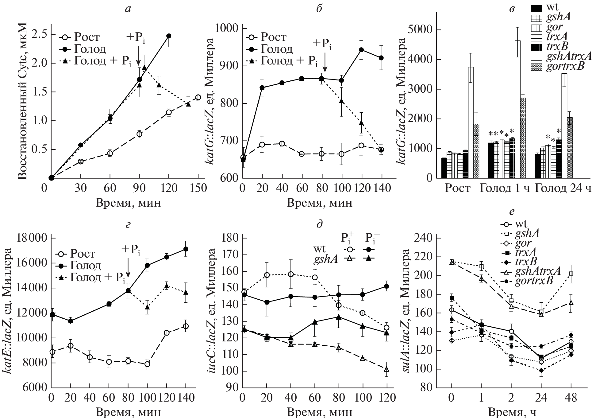 Changes in the activity of antioxidant systems in Escherichia coli during phosphate starvation were studied. It was shown that starvation was accompanied by a decrease in the intensity of respiration, an increase in the rate of superoxide production, and a decrease in the level of ATP. Simultaneously, there was a decrease in H2O2 in the medium and a significant increase in the expression of the katG and katE genes encoding the HPI and HPII catalases, respectively. At the same time, there was no drop in the membrane potential, which may indicate the retention of normal membrane activity in starving cells. It has been shown for the first time that the transition of E. coli to phosphate starvation is accompanied by significant changes in the status of glutathione. The most important of them are associated with a decrease in the level of glutathione reductive form (GSH) in the medium (GSHout) and with a simultaneous increase in its content in the cytoplasm (GSHin), as well as a shift in the GSHin to oxidized glutathione form (GSSGin) ratio towards reductive values, and GSHout/GSSGout towards oxidative values. Among the mutants used in the work, the double mutant gor trxB, deficient in the synthesis of glutathione reductase and thioredoxin reductase, showed the most pronounced distinctive features. Compared to the parental strain, this mutant showed a multiple higher expression of katG::lacZ, the highest level of oxidized intra- and extracellular glutathione, and, accordingly, the lowest GSH/GSSG ratio in both compartments. In general, the data obtained indicate that during phosphate starvation the interaction of the glutathione redox-system and regulons that control protection against reactive oxygen species creates conditions that allow maintaining the concentration of ROS below the toxic level. As a result, phosphate-starved E. coli cells can maintain a high viability for a long time that allows them quickly to resume growth after the addition of phosphate.