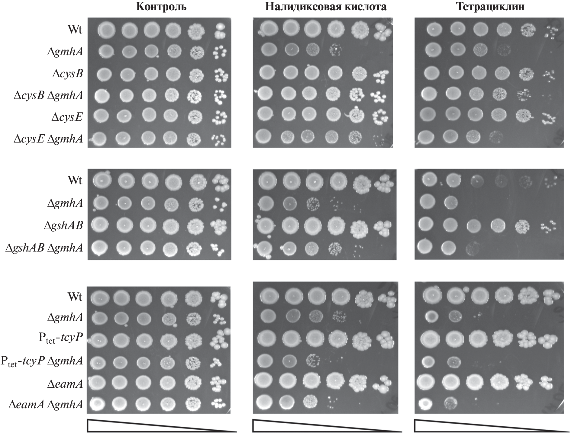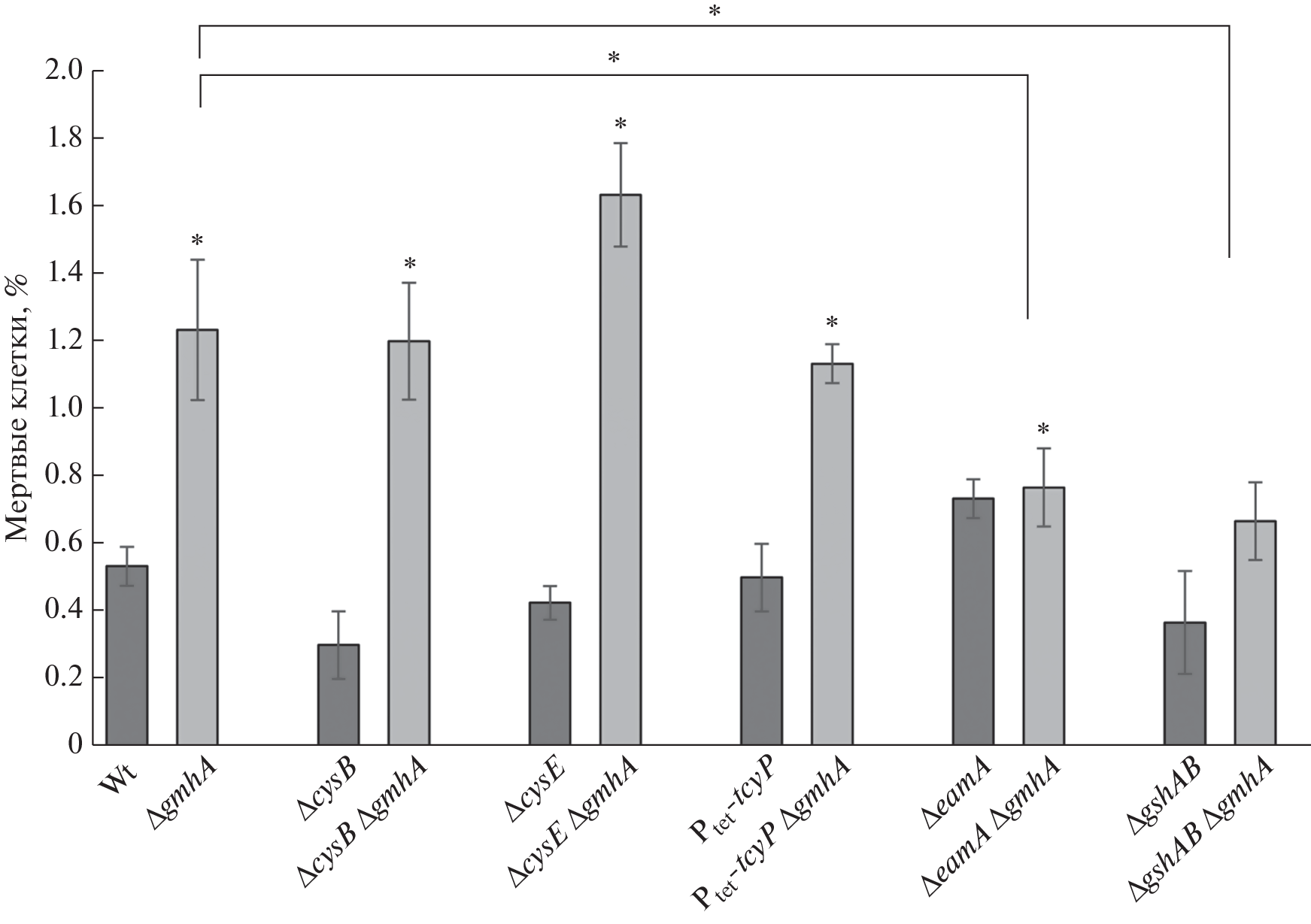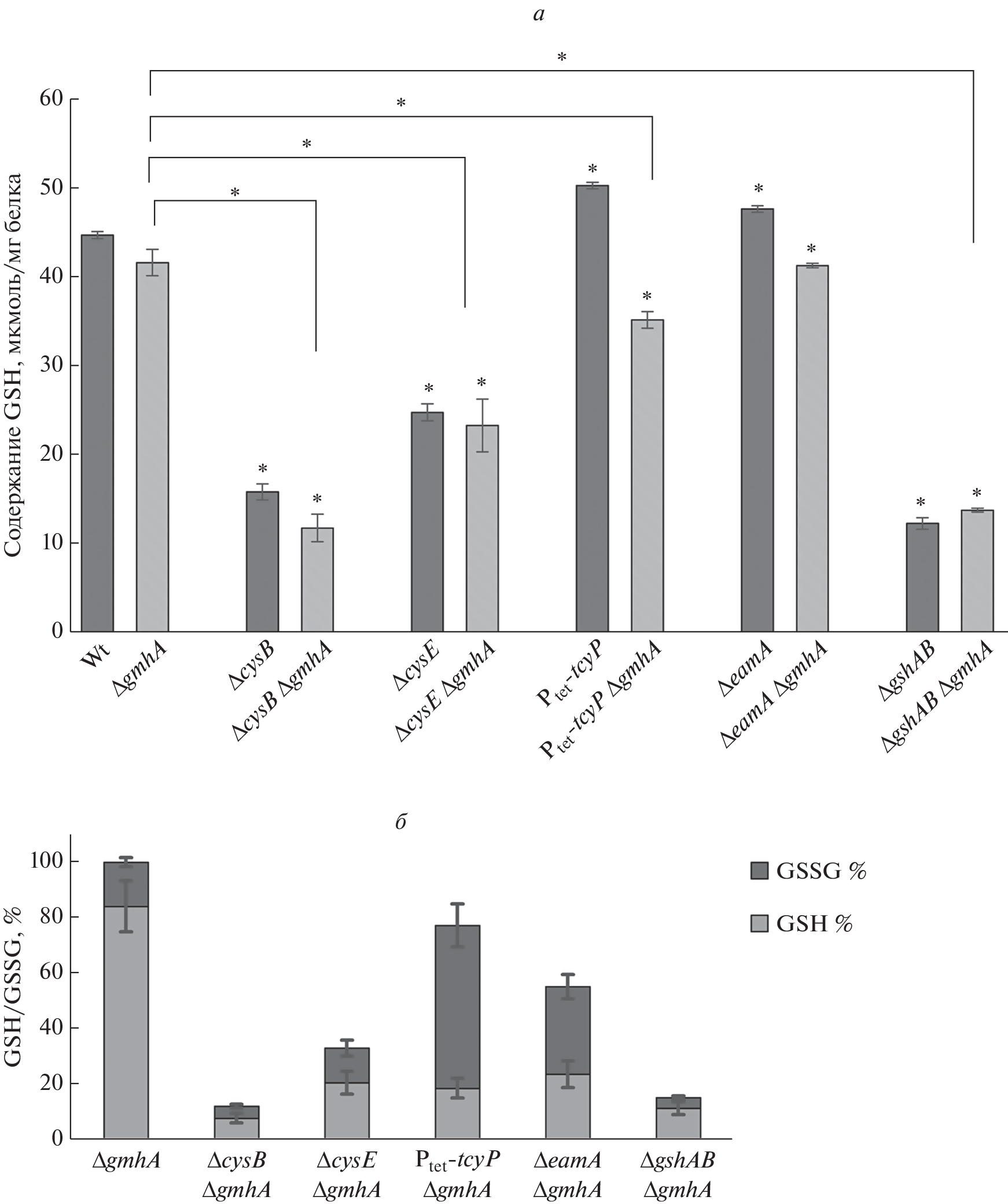 Low molecular weight thiols as glutathione and cysteine are an important part of the cell’s redox regulation system. Previously, we have shown that inactivation of ADP-heptose synthesis in Escherichia coli during gmhA deletion induces the oxidative stress. It is accompanied by rearrangement of thiol homeostasis and increased sensitivity to antibiotics. In our study, we found that restriction of cysteine metabolism (∆cysB and ∆cysE) and inhibition of glutathione synthesis (∆gshAB) lead to a decrease in the sensitivity of the ∆gmhA mutant to antibiotics but not to its expected increase. At the same time, blocking of the export of cysteine (∆eamA) or increasing the of the import (Ptet-tcyP) into cells of oxidized form of cysteine -cystine leads to an even greater increase in the sensitivity of gmhA-deleted cells to antibiotics. In addition, there is no correlation between the cytotoxic effect of antibiotics and the level of reactive oxygen species (ROS), the total pool of thiols or the viability of the initial cell population. However, a correlation between the sensitivity to antibiotics and the level of oxidized glutathione in cells was found in our study. Apparently, a decrease in the content of low molecular weight thiols saves NADPH equivalents and limits the processes of protein redox modification. It leads to increasing of resistance of the ∆gmhA strain to antibiotics. On the contrary, an increase in low molecular weight thiols levels requires a greater expenditure of cell resources, leads to an increase in oxidized glutathione and induces to greater increase in sensitivity of the ∆gmhA strain to antibiotics.