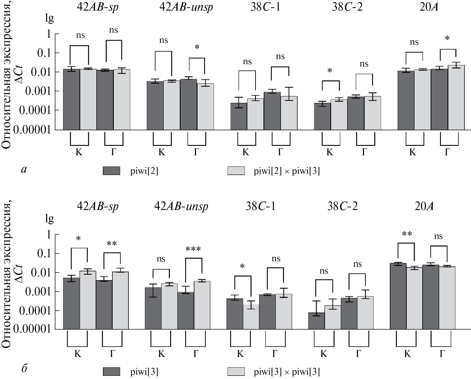 Далее проанализировали экспрессию того же набора ретротранспозонов у мутантов по гену piwi. Использованные в работе линии, гетерозиготные по мутации в гене piwi, несут инсерцию P-элемента в кодирующей части гена (в линии piwi[2] инсерция в 4-м экзоне, что соответствует белковому домену IMD-PIWI; в линии piwi[3] инсерция в 1-м экзоне, которая соответствует домену N-PAZ и структурным доменам) и балансерную хромосому 2L с мутацией CyO. Гомозиготы по мутации в линии piwi[2] нежизнеспособны, а в линии piwi[3] редко развиваются до имаго и имеют редуцированные яичники.