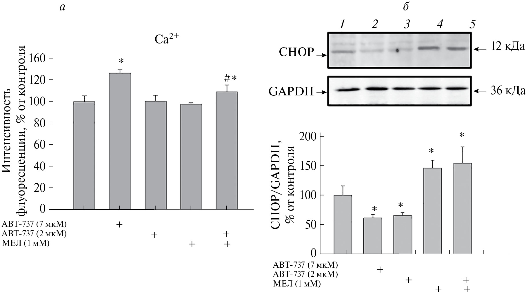 Рис. 5. Влияние МЕЛ и АВТ-737 на изменение цитозольного Са2+ и содержания CHOP в клетках ТНР-1. Клетки инкубировали с препаратами в течение 24 ч. а – Изменение содержания цитозольного Са2+. Интенсивность флуоресценции интактных клеток использовали в качестве контроля, данные представлены как среднее значение ± стандартное отклонение (n = 5). б – Иммуноокрашивание антителами к CHOP, GAPDH использовали в качестве контроля белковой нагрузки. Данные представлены как среднее значение ± стандартное отклонение (n = 4). *p < 0.05 – значимое изменение по сравнению с соответствующим контролем, #р < 0.05 – значимое изменение по сравнению с АВТ-737.