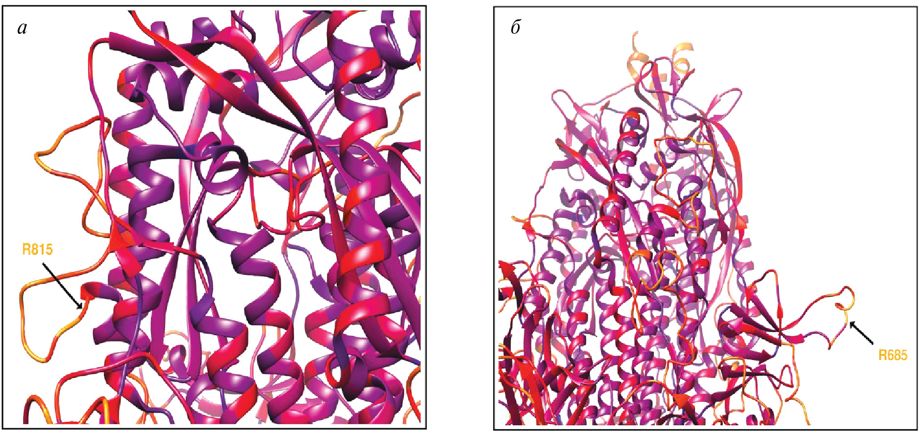 Рис. 2. Оценка протеолитической доступности сайтов S-гликопротеина SARS-CoV-2. а ‒ Отображение на структуре S-гликопротеина (PDB ID: 6VXX) оценок протеолитической доступности в области сайта S2’ (позиция R815). б ‒ Отображение на структуре S-гликопротеина оценок протеолитической доступности в области сайта S1/S2 (позиция R685). Цветовой градиент от синего к красному и далее к желтому соответствует изменениям от минимальной оценки протеолитической доступности, равной 0, к максимальной, равной 1.