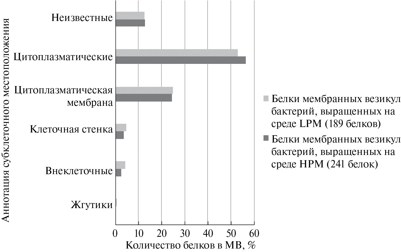 Анализ локализации белков показал, что везикулы бактерий, выращенных на среде LPM, включают больше белков, аннотированных как внеклеточные и связанные с цитоплазматической мембраной по сравнению с везикулами с HPM, которые содержат больше цитоплазматических белков (рис. 4).