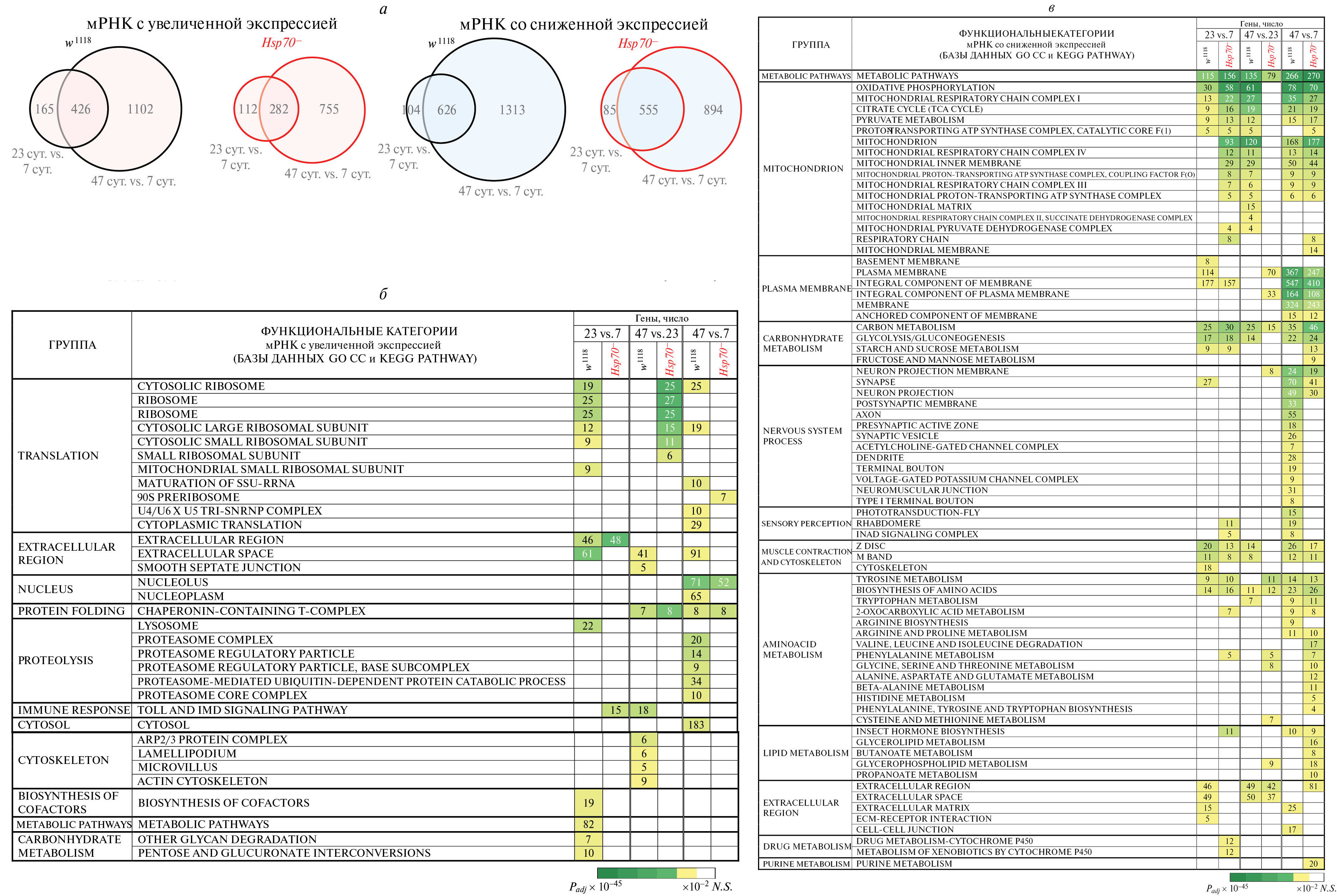 Рис. 2. Старение вызывает выраженные и прогрессирующие изменения транскриптомного профиля ног (состоящих преимущественно из пучков мышечных волокон) мух w1118. Нокаут шести генов семейства Hsp70 модулирует возрастные изменения транскриптома скелетных мышц ног. а – Количество уникальных и общих генов, экспрессия которых у 23- и 47-суточных мух отличается от экспрессии у 7-суточных мух. n = 4 пула (ноги 15 мух) каждой линии. б и в – Анализ функционального обогащения генами, экспрессия которых увеличилась (б) и снизилась (в). Представлено количество генов в каждой функциональной категории; тепловая карта показывает p-значение.