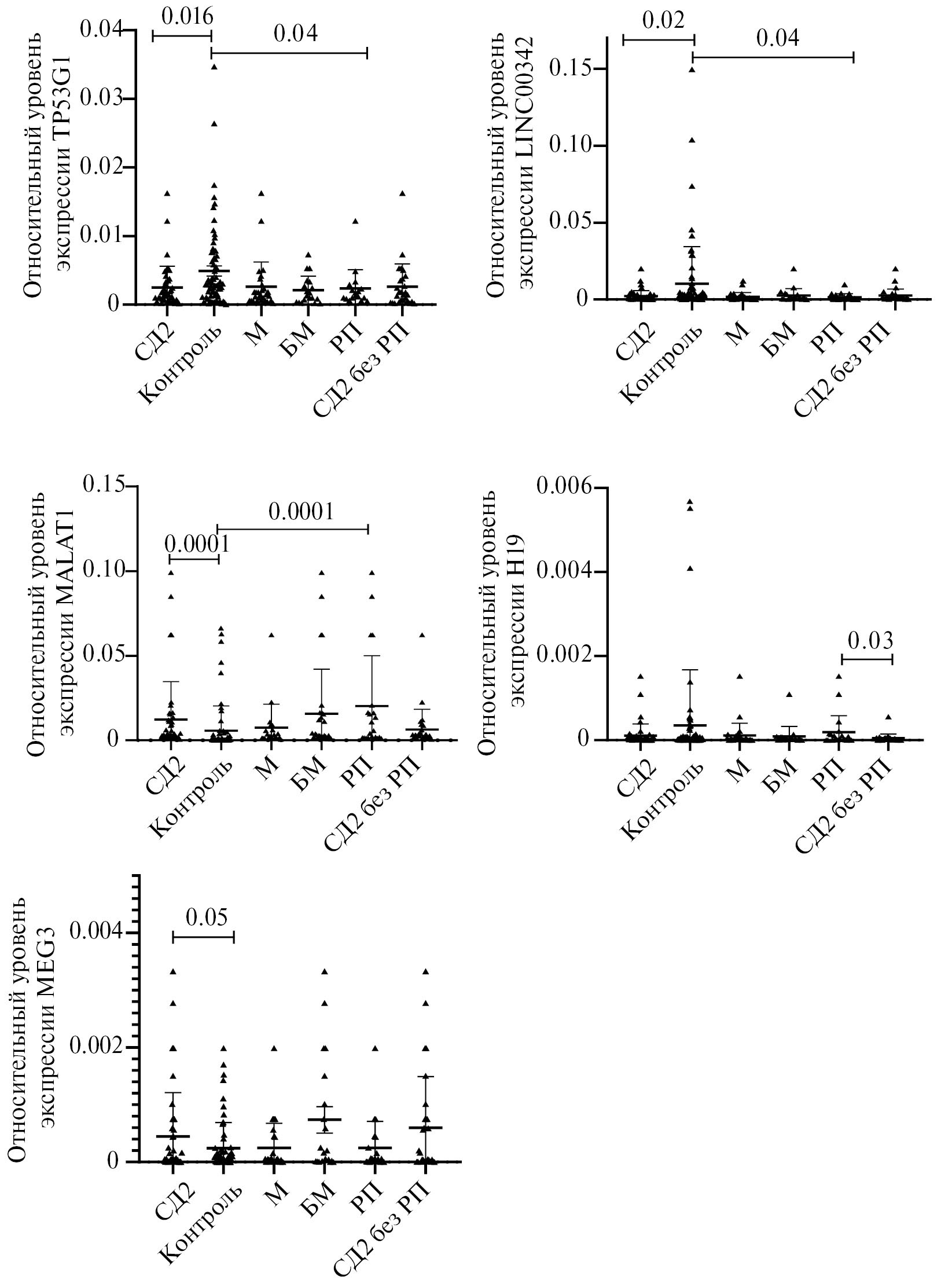 Исследования последних лет подтверждают существование связи между нарушением регуляции днРНК и формированием опухолевых, сердечно-сосудистых, воспалительных и метаболических заболеваний [7, 8]. Однако роль днРНК в развитии патологических состояний человека и молекулярные механизмы их действия остаются недостаточно изученными. В нашей работе оценена предиктивная значимость дифференциальной экспрессии ряда днРНК в формировании СД2 и диабетической ретинопатии. С этой целью определена экспрессия генов следующих днРНК: TP53TG1 (TP53 Target 1), LINC00342 (long intergenic non-protein coding RNA 342), MALAT1 (metastasis associated lung adenocarcinoma transcript 1), H19 (H19 imprinted maternally expressed transcript) и MEG3 (maternally expressed 3).