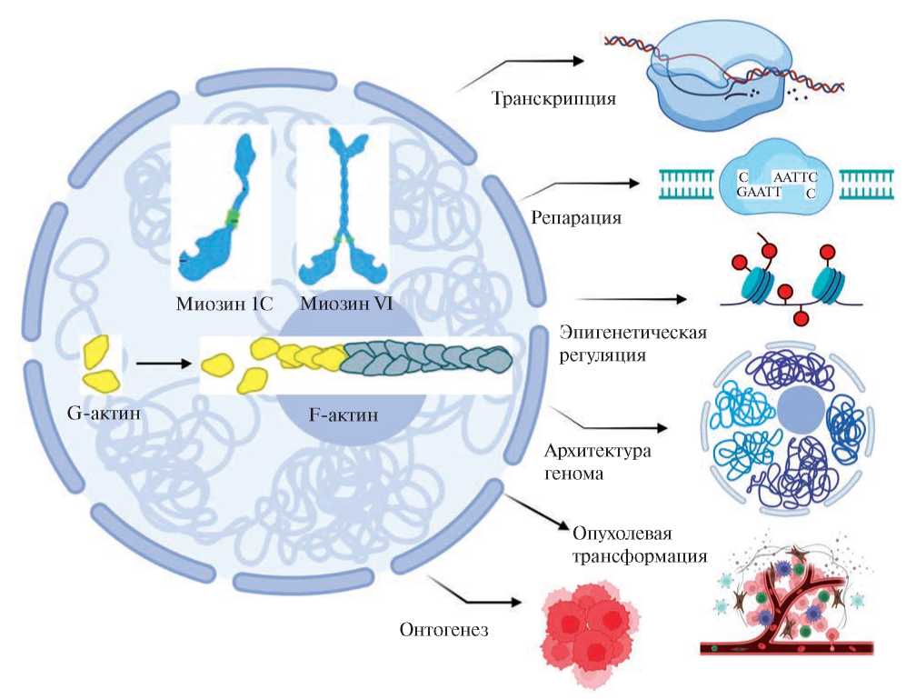 Исследования последних 10 лет показали, что актин и миозины ядра не образуют, как правило, актомиозиновых комплексов, как в цитоплазме [9], но при этом играют важную роль во всех фундаментальных процессах в ядре – от экспрессии генов до репарации ДНК [10–12]. В настоящее время ключевым вопросом биологии клеточного ядра стала его динамичная пространственная организация [13]. Актиновые филаменты и миозины ядра считаются идеальными кандидатами на роль организаторов динамического ядерного каркаса, который контролирует топологию ядерных доменов и их передвижение внутри ядра. Как мономеры актина, так и отдельные молекулы миозинов играют важную роль в качестве сигнальных молекул или кофакторов [14, 15] (например, в аллостерическом контроле комплексов ремоделирования хроматина). Полимеры актина в ядре вместе с немышечными миозинами участвуют в передвижении хромосом на относительно длинные (свыше 500 нм) расстояния [16], что необходимо для правильной пространственной организации процессов репарации ДНК [17]. Они также участвуют в контроле клеточного цикла [10] и определяют профиль экспрессии генов в онтогенезе млекопитающих [18] (рис. 1).