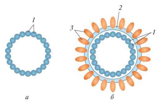 Рис. 1. Общая схема строения безоболочечных (а) и оболочечных (б) VLP. 1 – Структурный белок вируса, формирующий монобелковую VLP (если вирусных белков несколько, то они формируют мультибелковую VLP, в которой может быть уже несколько слоев); 2 – фосфолипидная мембрана, образованная из мембраны эндоплазматического ретикулума клетки-продуцента; 3 – вирусные мембранные или трансмембранные гликопротеины.