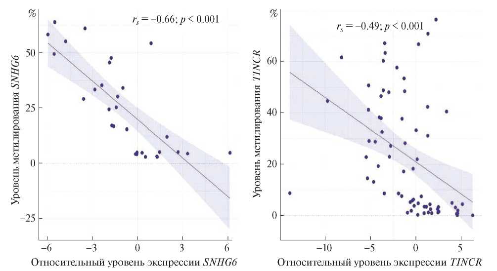 С использованием коэффициента корреляции Спирмена (rs) сопоставлены изменения уровней метилирования и экспрессии генов днРНК SNHG6, SNHG12 и TINCR в общих выборках образцов РЯ. Выявлена значимая отрицательная корреляция этих параметров генов SNHG6 (rs = −0.66, p < 0.001) и TINCR (rs = −0.49, p < 0.001) (рис. 5).