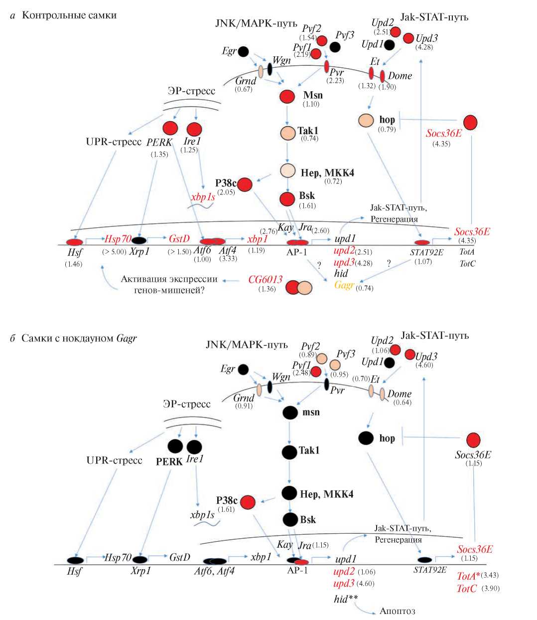 Рис. 3. Транскрипционный ответ генов сигнальных путей JNK/MAPK, JAK/STAT и ЭПР-стресса в ответ на воздействие персульфата аммония в кишечнике контрольных самок (а) и самок с нокдауном Gagr (б). Для построения схем сигнальных путей использованы данные из работ [20] и [23]. Красным показаны гены, транскрипция которых повысилась более чем в 2 раза. Розовым выделены гены, чья экспрессия повысилась в 1.5–2 раза. В скобках около генов приведено значение LFC, жирным выделены киназы; xbp1s – сплайсированная форма xbp1. *TotA – экспрессия этого гена у особей с нокдауном ниже, чем в контроле, но индуцируется при стрессовом ответе; **hid – экспрессия этого гена у особей с нокдауном Gagr выше, чем в контроле, и не индуцируется при стрессовом ответе.