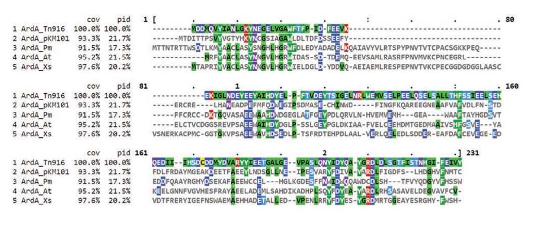 Рис. 1. Выравнивание аминокислотных последовательностей, кодируемых генами ardA конъюгативной плазмиды pKM101, транспозона Tn916, A. tumefaciens, P. monteilii и Xanthomonas sp. (-) – отсутствие гомологичной аминокислоты, значение Cov показывает процент покрытия каждой последовательности, pid – содержание (%) идентичных аминокислот.