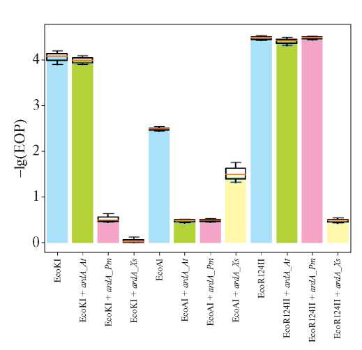 Оценка антирестрикционной активности. С целью проверки антирестрикционной активности генов ardA_At, ardA_Pm и ardA_Xs против трех RMI грамотрицательных бактерий – EcoKI, EcoAI и EcoR124II – проводили посев немодифицированного фага λо на три типа клеток штамма TG1: бесплазмидные; с плазмидами, несущими гены RMI-систем; с плазмидами, несущими гены RMI и гены ardA_At, ardA_Pm и ardA_Xs (табл. 1). Посев фага и подсчет эффективности посева фага (EOP) проводили согласно [10].
