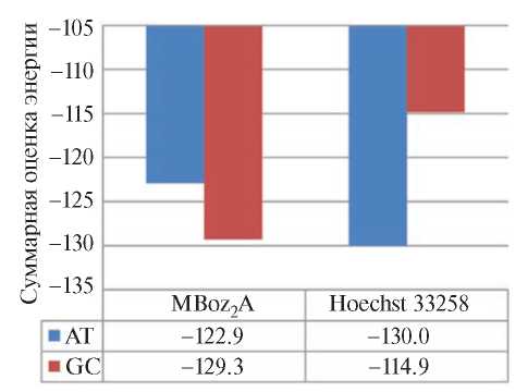 Рис. 3. Расчетные значения энергии комплексов MBoz₂A и Hoechst 33258 с d(A-T)₁₀ и d(G-C)₁₀.