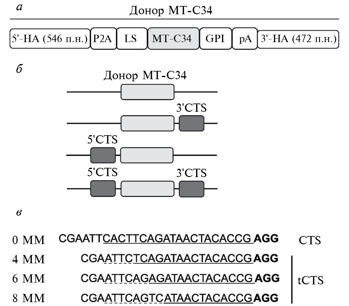 Рис. 1. Схема донорной конструкции для нокина MTC34 в экзон-2 локуса CXCR4 (а) и ее модификаций (б, в). Обозначения: 5ʹ-HA – 5ʹ-плечо гомологии; Р2А – сигнал пропуска рибосомы; LS – лидерная последовательность; GPI – последовательность для модификации пептида GPI-якорем; рА – сигнал полиаденилирования; 3ʹ-HA – 3ʹ-плечо гомологии. б – Схематичное изображение плазмид, несущих CTS на 5ʹ- или 3ʹ- конце донорной ДНК (перед 5ʹ-HA или после 3ʹ-НА соответственно); в – последовательности CTS и tCTS. 0MM – в протоспейсере нет некомплементарных оснований; 4MM, 6MM и 8MM – на 5ʹ-конце протоспейсера находятся соответственно 4, 6 или 8 некомплементарных оснований. Сайт РАМ показан жирным шрифтом, протоспейсер подчеркнут, некомплементарные основания в его составе подчеркнуты пунктирной линией. Здесь: CTS – таргетная последовательность Cas9, соответствующая протоспейсеру вместе с РАМ; tCTS – таргетная последовательность Cas9, соответствующая протоспейсеру с некомплементарными основаниями.