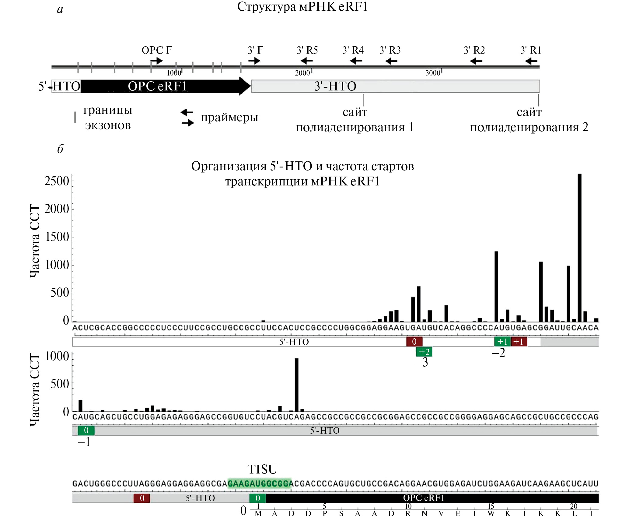 Рис. 1. Структура мРНК eRF1. а – Схема организации референсной мРНК eRF1 NM_004730. Стрелками отмечены праймеры, использованные для получения 3′-НТО мРНК eRF1. б – Схема организации 5′-НТО eRF1 и частота использования сайтов старта транскрипции согласно базе DBTSS. Зелеными и красными прямоугольниками отмечены старт- и стоп-кодоны соответственно. Цифра внутри прямоугольников означает рамку считывания относительно основной ОРС. Цифра рядом с зелеными квадратами означает порядковый номер AUG относительно старт-кодона основной ОРС, принятый за 0. Светло-зеленым цветом выделена последовательность регуляторного элемента TISU. Серым обозначена укороченная последовательность 5′-НТО eRF1, изучаемая в работе, наряду с полноразмерной.