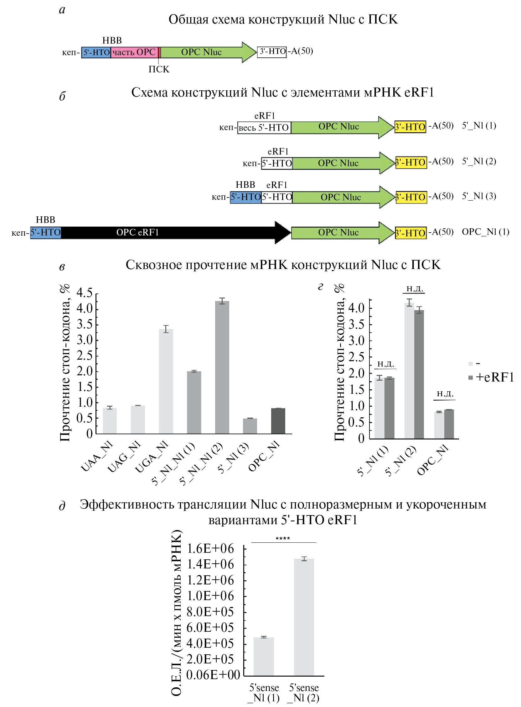 Изучение сквозного прочтения стоп-кодона UAG 5′-ОРС показывает, что на него влияет предшествующая последовательность: максимальная эффективность сквозного прочтения наблюдается на укороченной 5′-НТО eRF1 (более распространенной в клетке), чуть хуже прочитывается стоп-кодон с полноразмерной 5′-НТО eRF1 и хуже всего происходит сквозное прочтение стоп-кодона с 5′-НТО HBB (рис. 2в).