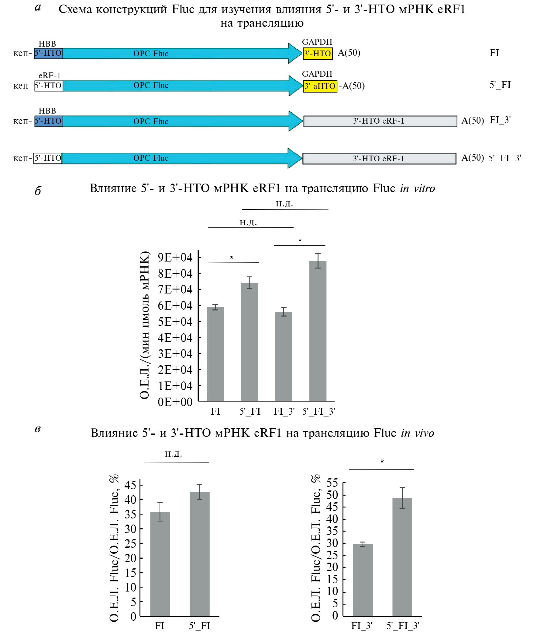 Этот же эксперимент мы повторили in vivo в клетках HEK293, трансфицировав их теми же мРНК в соответствии с методом FLERT (Fleeting mRNA Transfection technique) [38]. In vivo 5′- и 3′-НТО eRF1 совместно достоверно улучшают трансляцию репортера Fluc, в то время как одна 3′-НТО eRF1 не влияет заметно на трансляцию (рис. 3в). Таким образом, 5′-НТО eRF1 сильнее всего влияет на трансляцию фактора терминации, тогда как эффект 3′-НТО eRF1 зависит от наличия 5′-НТО eRF1.