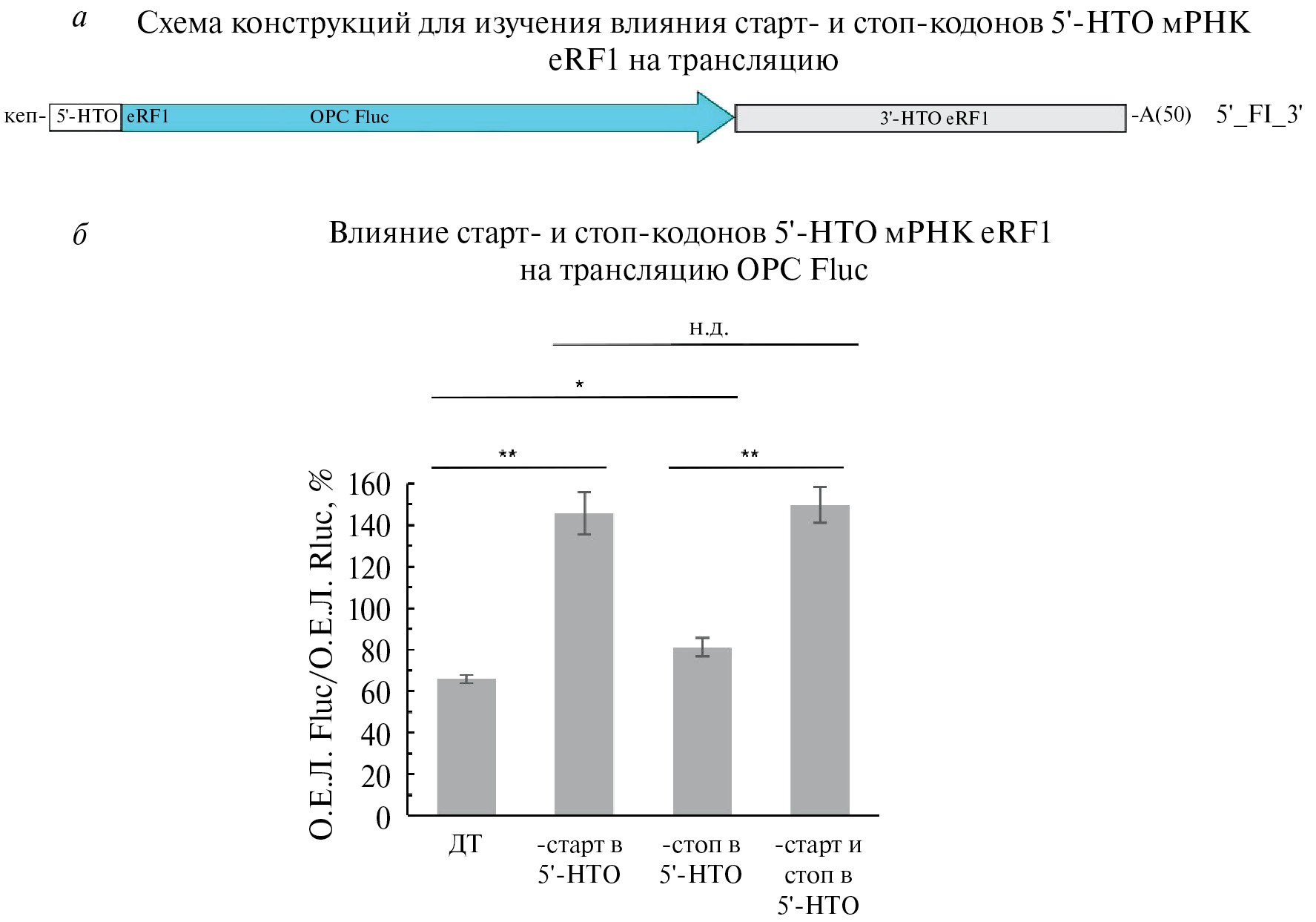 Рис. 4. Влияние старт- и стоп-кодонов в кОРС 5′-НТО мРНК eRF1. а – Общая схема конструкций, представляющая четыре варианта мРНК: “ДТ” – дикий тип 5′-НТО eRF1 не изменена и содержит старт- и стоп-кодон кОРС, “-старт в 5′-НТО” – старт-кодон кОРС заменен на кодон AAG, “-стоп в 5′-НТО” – стоп-кодон кОРС заменен на UCG, “-старт и стоп в 5′-НТО” – старт-кодон кОРС заменен на кодон AAG, а стоп-кодон – на UCG. б – Эффективность трансляции in vivo в клетках HEK293 репортерной мРНК с мутациями старт- и стоп-кодона кОРС 5′-НТО из мРНК eRF1.