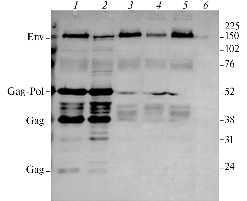 Клетки CHO заражали вирусами осповакцины, содержащими гены env и gag-pol ВИЧ-1, а также коинфицировали рекомбинантными вирусами, которые содержали интактный ген hr ВКО [22] (рис. 1, дорожки 1‒4), или контрольным VVSC11 (рис. 1, дорожки 5, 6). Как видно из рис. 1, при коэкспрессии генов env ВИЧ-1 и hr ВКО в клетках CHO синтезировались белки Env и Gag (дорожки 2, 4), в то время как в отсутствие hr эти белки обнаружить на удалось (дорожка 6). При коинфицировании с VVGag-Pol в клетках Hep2 и CHO наблюдались продукты нарезания белков Gag, что обусловлено присутствием в конструкции вирусной протеазы (дорожки 1, 2).
